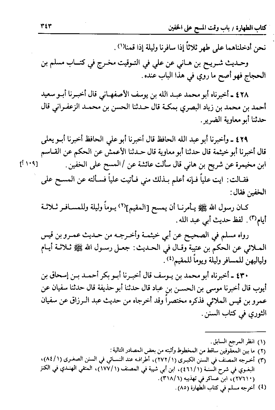 رواه مسلم في الصحيح عن أبي خيثمة وأخرجه من حديث عمرو بن قيس الملائي عن الحكم بن عتيبة وقال في الحديث : جعل رسول الله صلى الله عليه وسلم ثلاثة أيام ولياليهن للمسافر وليلة ويوما للمقيم.