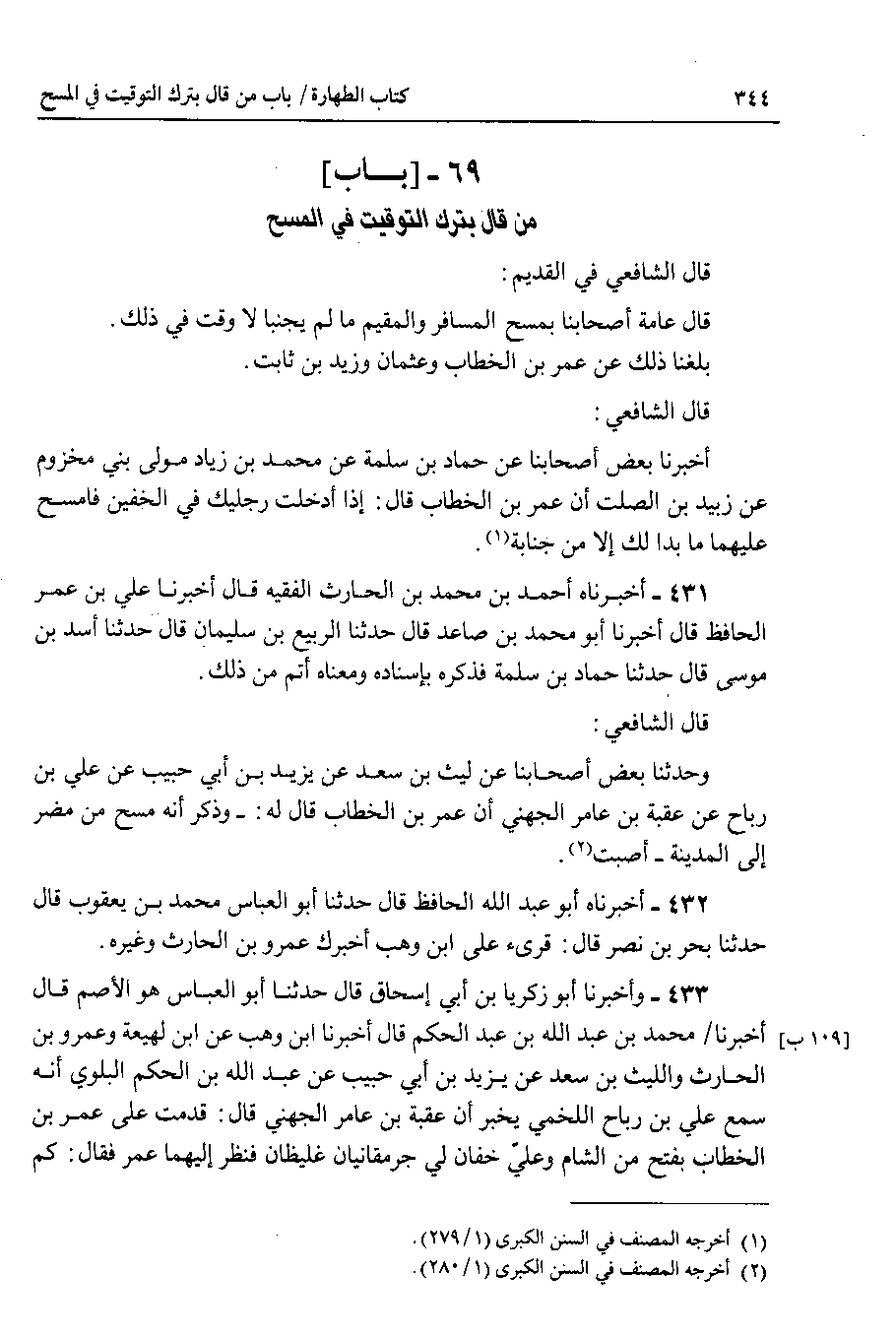أَخْبَرَنَا بعض أصحابنا عن حماد بن سلمة عن محمد بن زياد مولى بني مخزوم عن زبيد بن الصلت أن عمر بن الخطاب قال : إذا أدخلت رجليك في الخفين فامسح عليهما ما بدا لك إلا من جنابة.