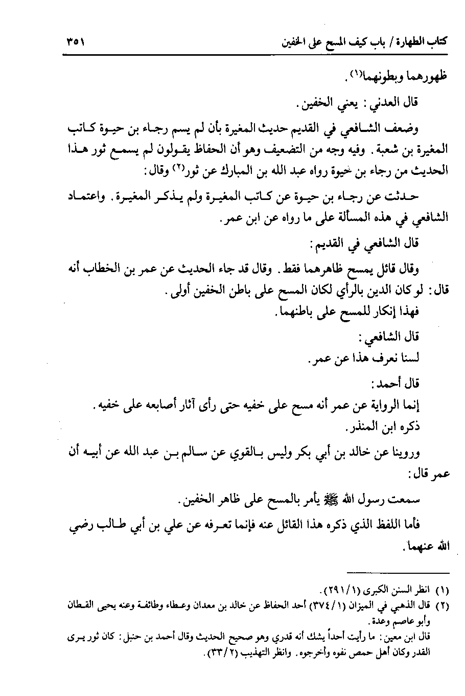 وضعف الشافعي في القديم حديث المغيرة بأن لم يسم رجاء بن حيوة كاتب المغيرة بن شعبة . وفيه وجه من التضعيف وهو أن الحفاظ يقولون لم يسمع ثور هذا الحديث من رجاء بن حيوة رواه عبد الله بن المبارك عن ثور وقال : حدثت عن رجاء بن حيوة عن كاتب المغيرة ولم يذكر المغيرة . واعتماد الشافعي في هذه المسألة على ما رواه عن ابن عمر.