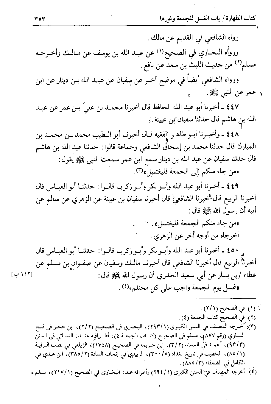 448 - وأخبرنا أبو طاهر الفقيه قال أخبرنا أبو الطيب محمد بن محمد بن المبارك قال حدثنا محمد بن إسحاق الشافعي وجماعة قالوا : حدثنا عبد الله بن هاشم قال حدثنا سفيان عن عبد الله بن دينار سمع ابن عمر سمعت النبي صلى الله عليه وسلم يقول : من جاء منكم إلى الجمعة فليغتسل.