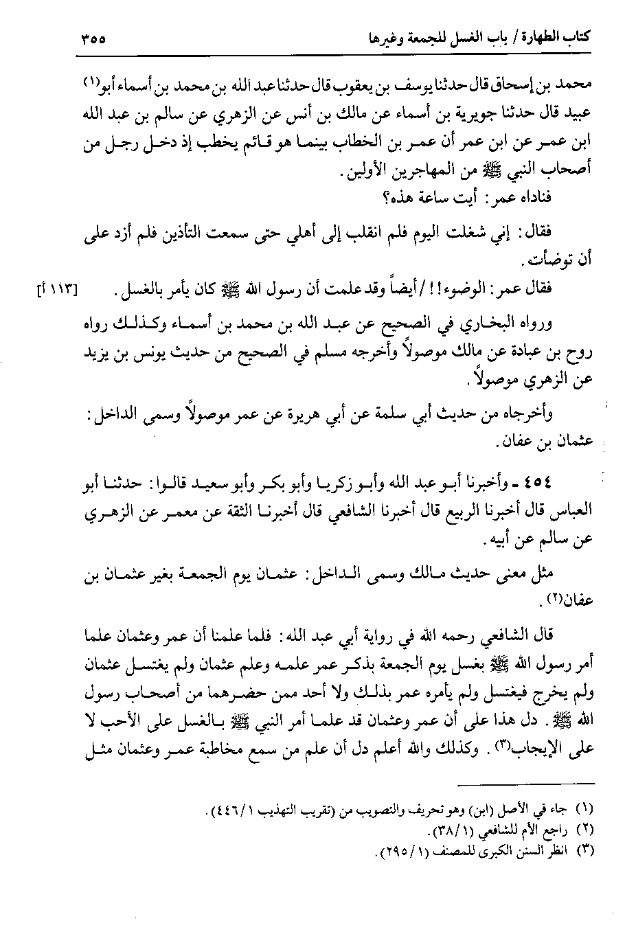 قال الشافعي رحمه الله في رواية أبي عبد الله : فلما علمنا أن عمر وعثمان علما أمر رسول الله صلى الله عليه وسلم بغسل يوم الجمعة بذكر عمر علمه وعلم عثمان ولم يغتسل عثمان ولم يخرج فيغتسل ولم يأمره عمر بذلك ولا أحد ممن حضرهما من أصحاب رسول الله صلى الله عليه وسلم . دل هذا على أن عمر وعثمان قد علما أمر النبي صلى الله عليه وسلم بالغسل على الأحب لا على الإيجاب . وكذلك والله أعلم دل أن علم من سمع مخاطبة عمر وعثمان مثل
