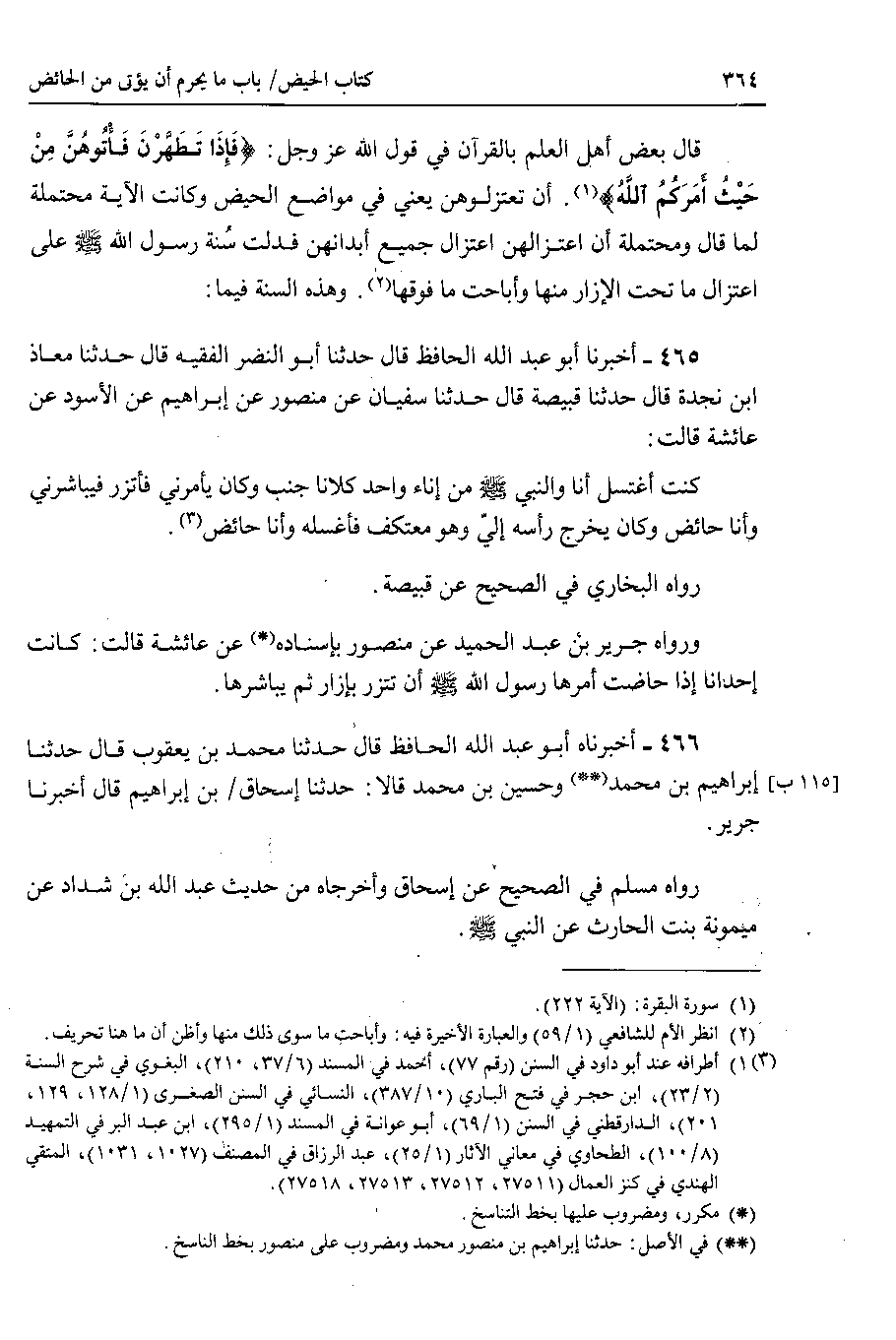 ورواه جرير بن عبد الحميد عن منصور بإسناده عن عائشة قالت : كانت إحدانا إذا حاضت أمرها رسول الله صلى الله عليه وسلم أن تتزر بإزار ثم يباشرها.