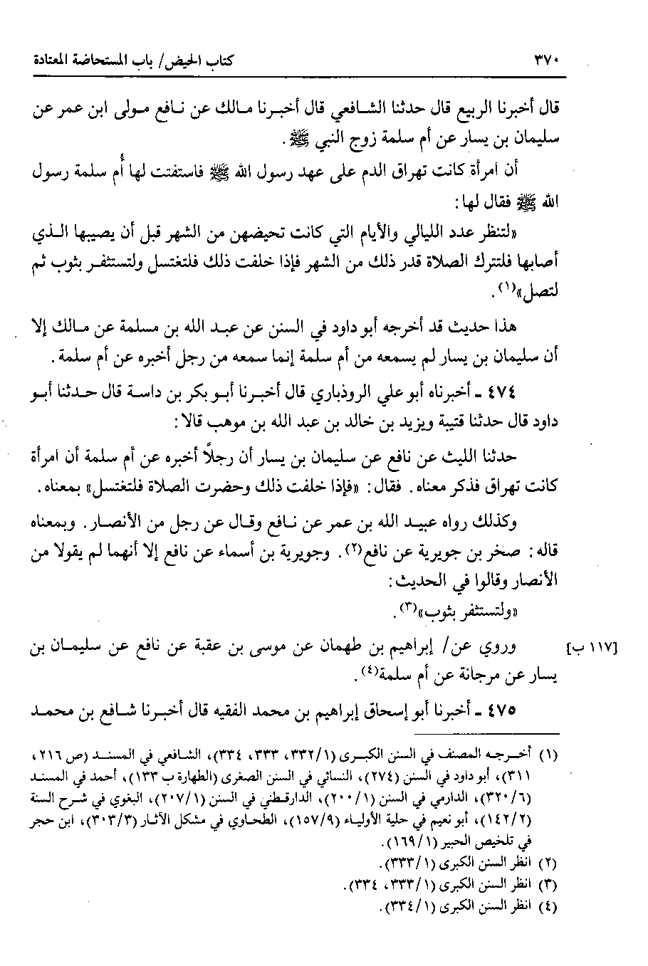 474 - أخبرناه أبو علي الروذباري قال أخبرنا أبو بكر بن داسة قال حدثنا أبو داود قال حدثنا قتيبة ويزيد بن خالد بن عبد الله بن موهب قالا : حدثنا الليث عن نافع عن سليمان بن يسار أن رجلا أخبره عن أم سلمة أن امرأة كانت تهراق فذكر معناه . فقال : فإذا خلفت ذلك وحضرت الصلاة فلتغتسل بمعناه.