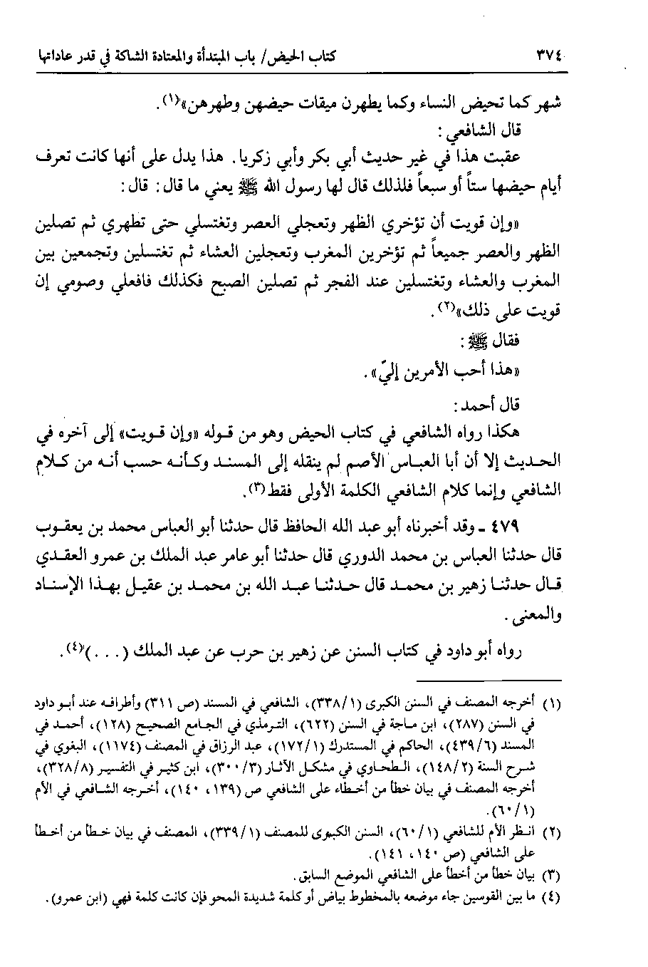 قال أحمد Y هكذا رواه الشافعي في كتاب الحيض وهو من قوله وإن قويت إلى آخره في الحديث إلا أن أبا العباس الأصم لم ينقله إلى المسند وكأنه حسب أنه من كلام الشافعي وإنما كلام الشافعي الكلمة الأولى فقط.