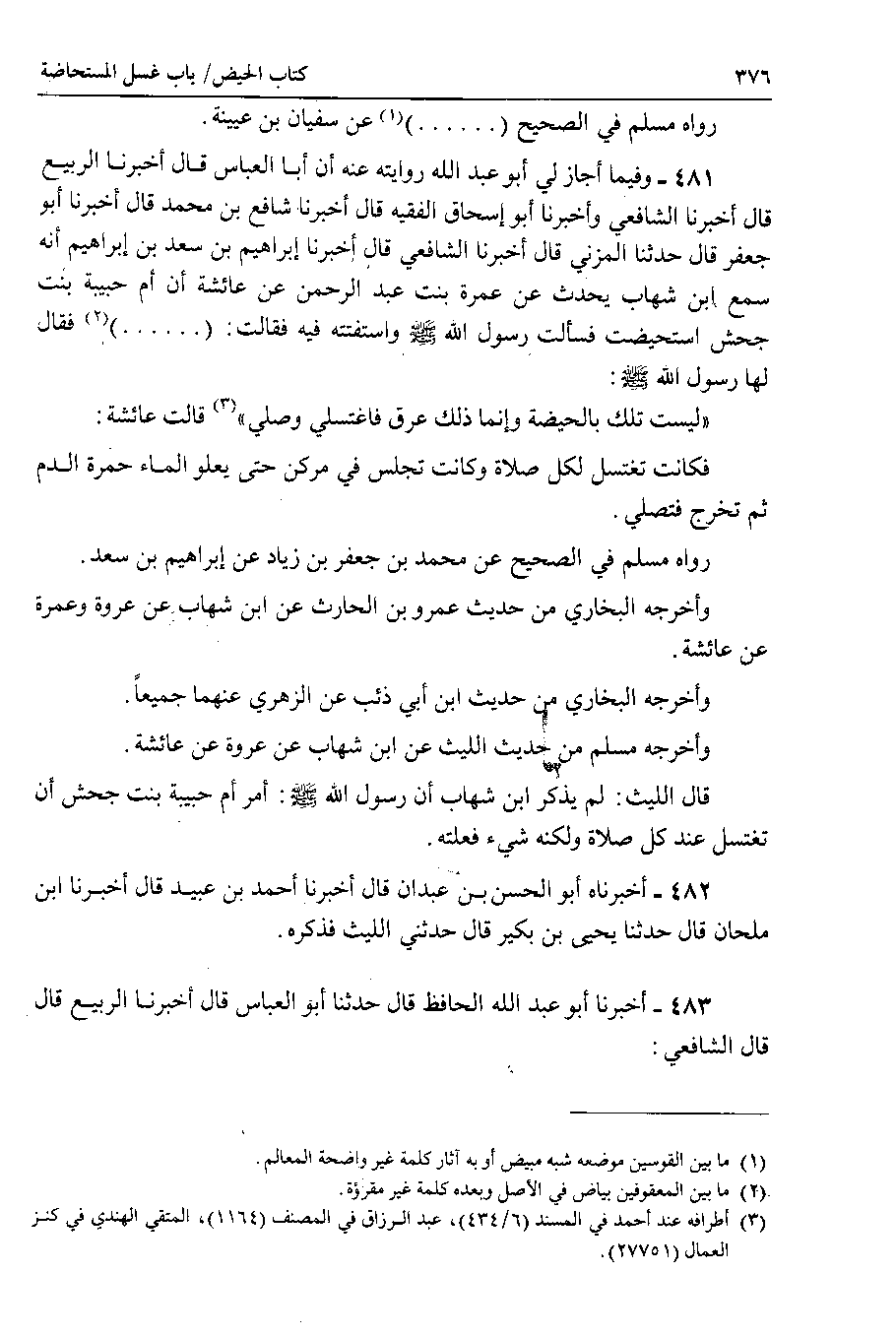 481 - وفيما أجاز لي أبو عبد الله روايته عنه أن أبا العباس قال أخبرنا الربيع قال أخبرنا الشافعي وأخبرنا أبو إسحاق الفقيه قال أخبرنا شافع بن محمد قال أخبرنا أبو جعفر قال حدثنا المزني قال أخبرنا الشافعي قال أخبرنا إبراهيم بن سعد بن إبراهيم أنه سمع ابن شهاب يحدث عن عمرة بنت عبد الرحمن عن عائشة أن أم حبيبة بنت جحش استحيضت فسألت رسول الله صلى الله عليه وسلم واستفتته فيه فقالت : ( . . . . . . ) فقال لها رسول الله صلى الله عليه وسلم : ليست تلك بالحيضة وإنما ذلك عرق فاغتسلي وصلي قالت عائشة : فكانت تغتسل لكل صلاة وكانت تجلس في مركن حتى يعلو الماء حمرة الدم ثم تخرج فتصلي.