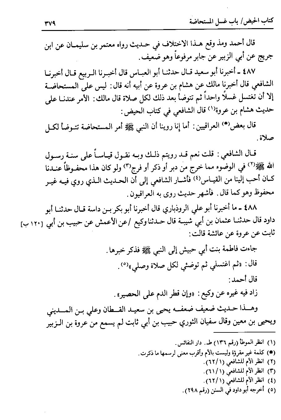 487 - أخبرنا أبو سعيد قال حدثنا أبو العباس قال أخبرنا الربيع قال أخبرنا الشافعي قال أخبرنا مالك عن هشام بن عروة عن أبيه انه قال : ليس على المستحاضة إلا أن تغتسل غسلاً واحدا ثم تتوضأ بعد ذلك لكل صلاة قال مالك : الأمر عندنا على حديث هشام بن عروة قال الشافعي في كتاب الحيض : قال بعض العراقيين : أما إنا روينا أن النبي صلى الله عليه وسلم أمر المستحاضة تتوضأ لكل صلاة.