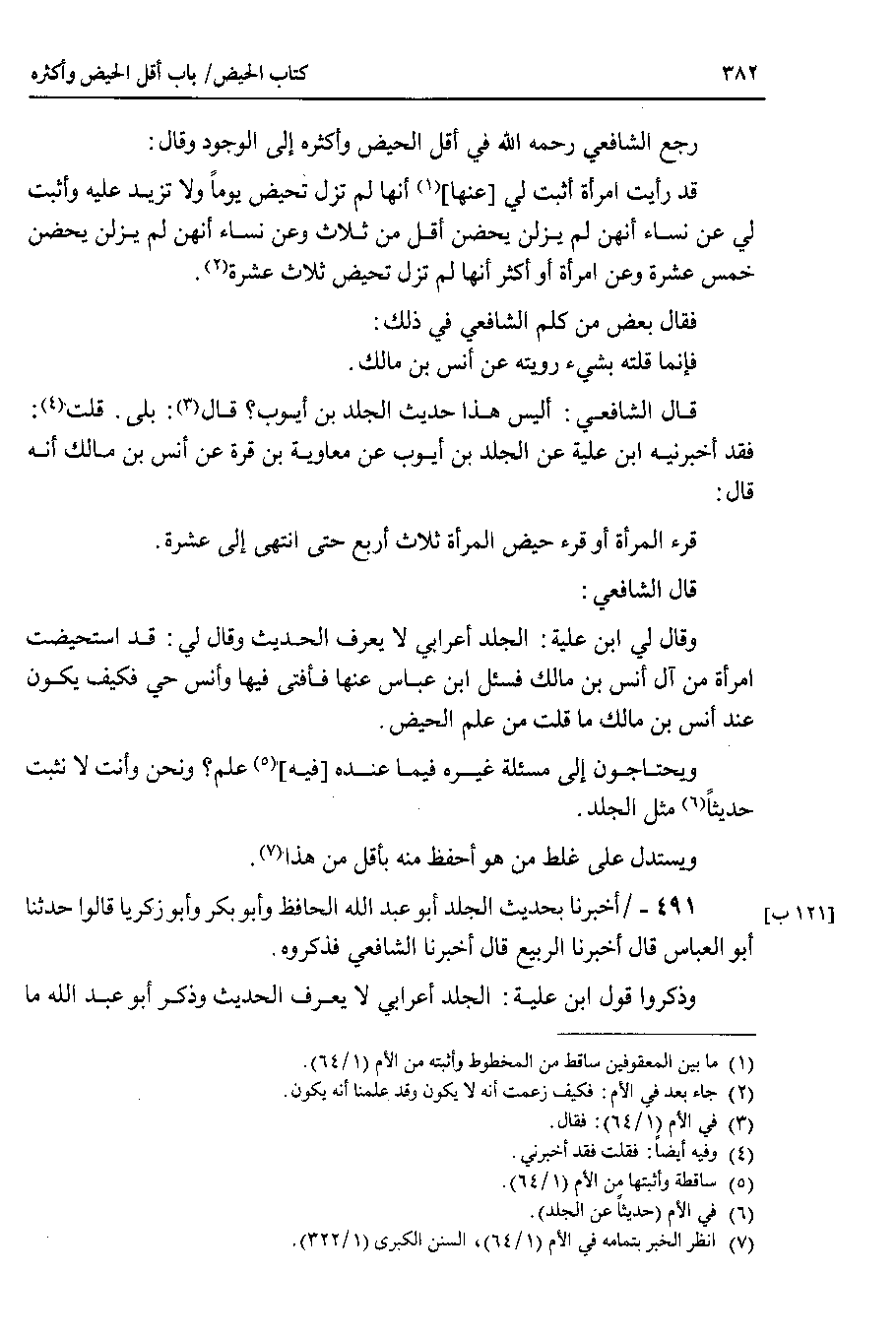 قال الشافعي : وقال لي ابن علية : الجلد أعرابي لا يعرف الحديث وقال لي : قد استحيضت امرأة من آل أنس بن مالك فسئل ابن عباس عنها فأفتى فيها وأنس حي فكيف يكون عند أنس بن مالك ما قلت من علم الحيض.