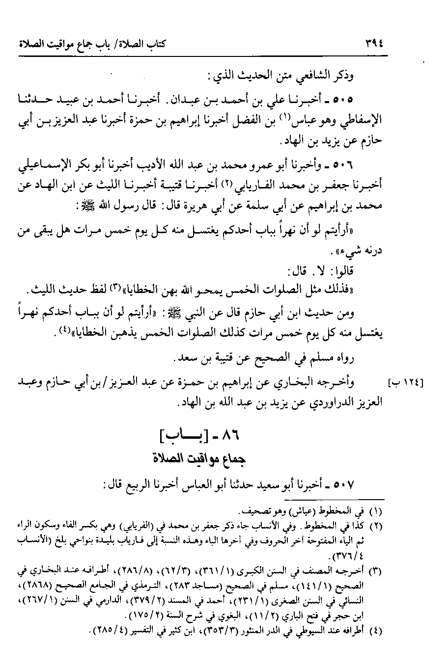 506 - وأخبرنا أبو عمرو محمد بن عبد الله الأديب أخبرنا أبو بكر الإسماعيلي أخبرنا جعفر بن محمد الفاريابي أخبرنا قتيبة أخبرنا الليث عن ابن الهاد عن محمد بن إبراهيم عن أبي سلمة عن أبي هريرة قال : قال رسول الله صلى الله عليه وسلم : أرأيتم لو أن نهراً بباب أحدكم يغتسل منه كل يوم خمس مرات هل يبقى من درنه شيء.