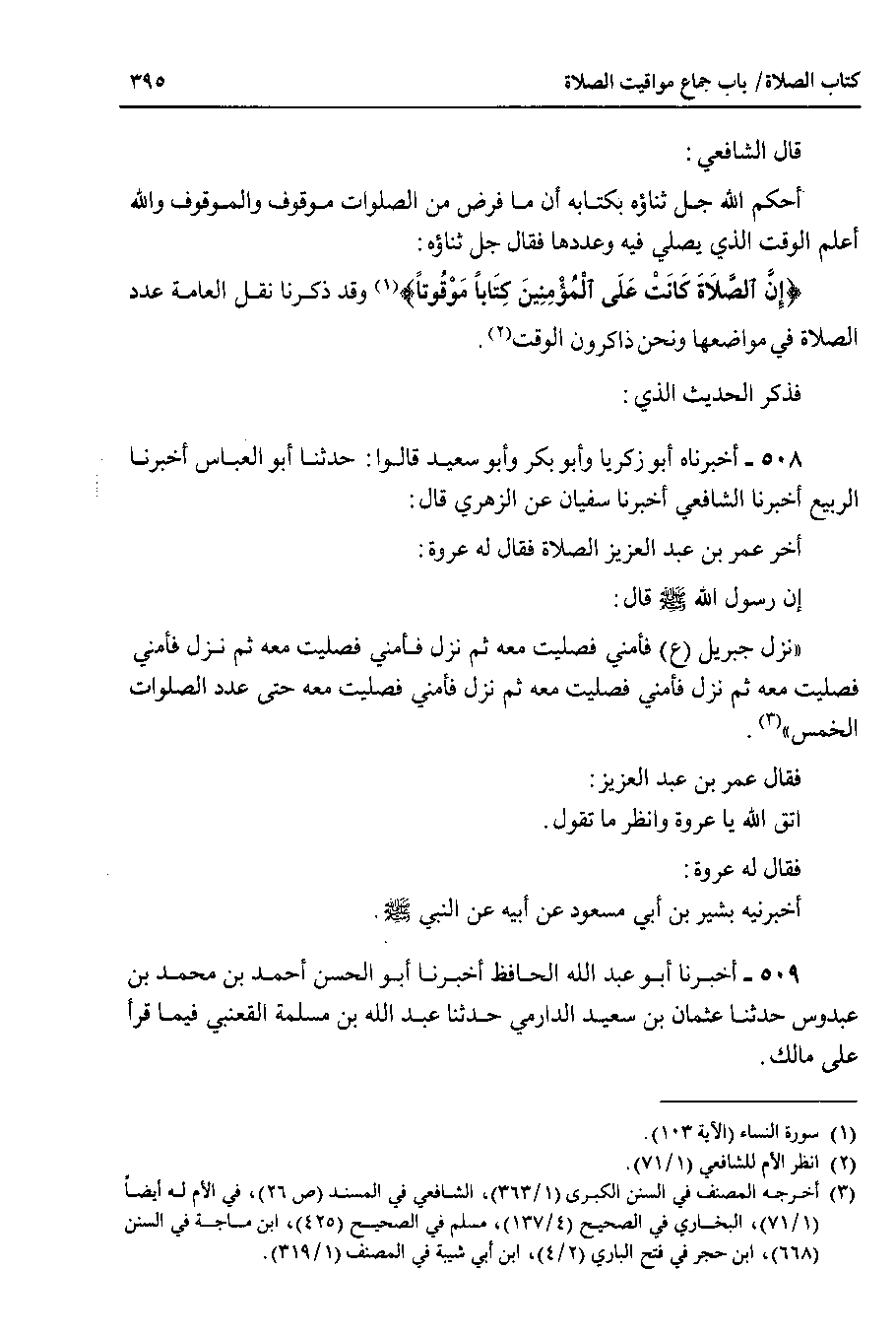 فذكر الحديث الذي 508 - أخبرناه أبو زكريا وأبو بكر وأبو سعيد قالوا : حدثنا أبو العباس أخبرنا الربيع أخبرنا الشافعي أخبرنا سفيان عن الزهري قال : أخر عمر بن عبد العزيز الصلاة فقال له عروة : إن رسول الله صلى الله عليه وسلم قال : نزل جبريل ( ع ) فأمني فصليت معه ثم نزل فأمني فصليت معه ثم نزل فأمني فصليت معه ثم نزل فأمني فصليت معه ثم نزل فأمني فصليت معه حتى عدد الصلوات الخمس.