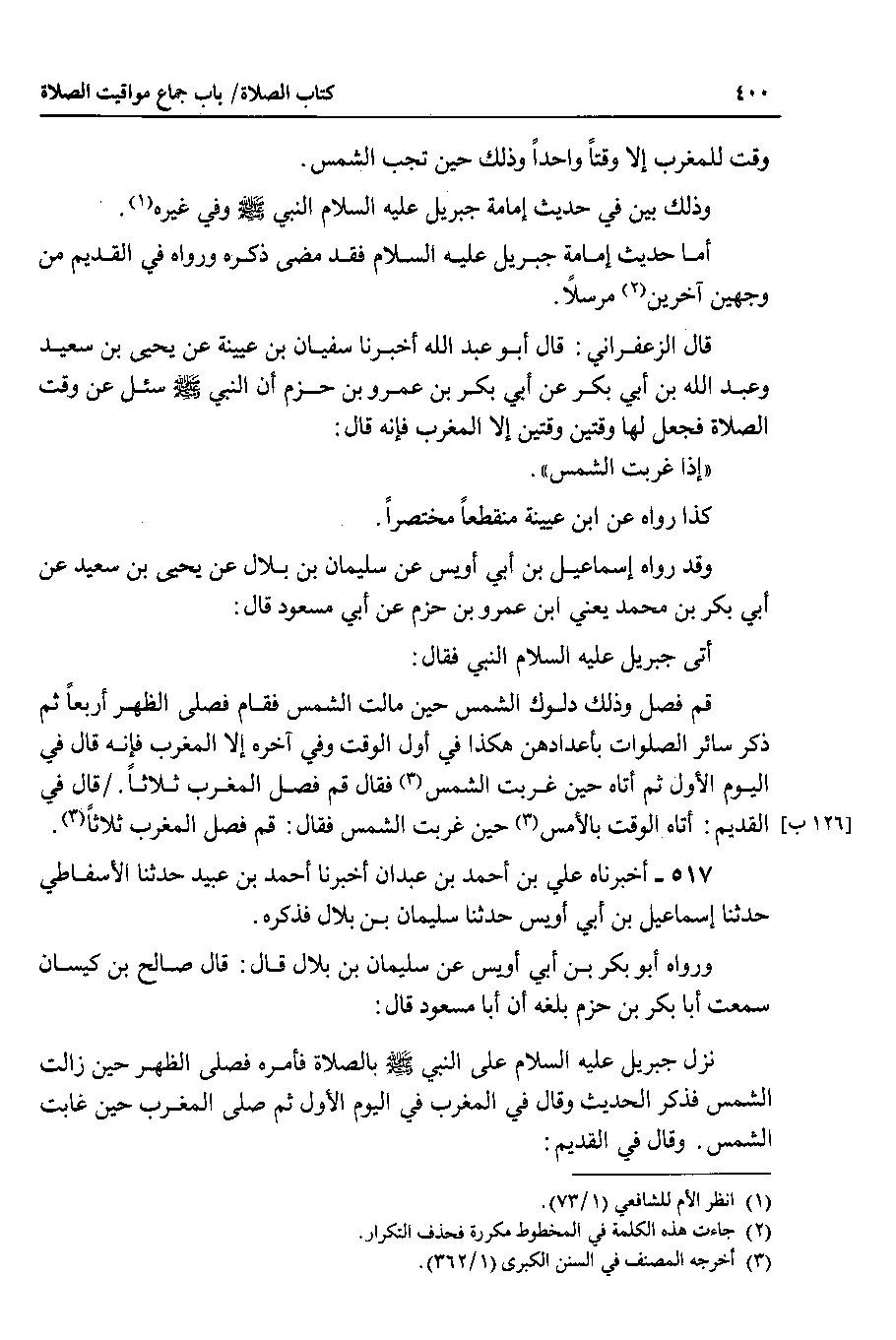 ورواه أبو بكر بن أبي أويس عن سليمان بن بلال قال : قال صالح بن كيسان سمعت أبا بكر بن حزم بلغه أن أبا مسعود قال : نزل جبريل عليه السلام على النبي صلى الله عليه وسلم بالصلاة فأمره فصلى الظهر حين زالت الشمس فذكر الحديث وقال في المغرب في اليوم الأول ثم صلى المغرب حين غابت الشمس . وقال في القديم