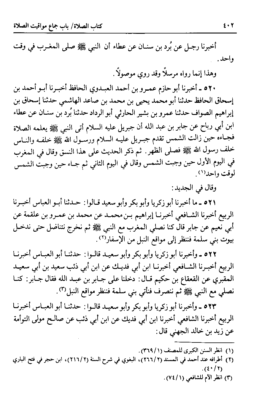 522 - وأخبرنا أبو زكريا وأبو بكر وأبو سعيد قالوا : حدثنا أبو العباس أخبرنا الربيع أخبرنا الشافعي أخبرنا ابن أبي فديك عن ابن أبي ذئب سعيد بن أبي سعيد المقبري عن القعقاع بن حكيم قال : دخلنا على جابر بن عبد الله فقال جابر : كنا نصلي مع النبي صلى الله عليه وسلم ثم ننصرف فنأتي بني سلمة فننظر مواقع النبل.