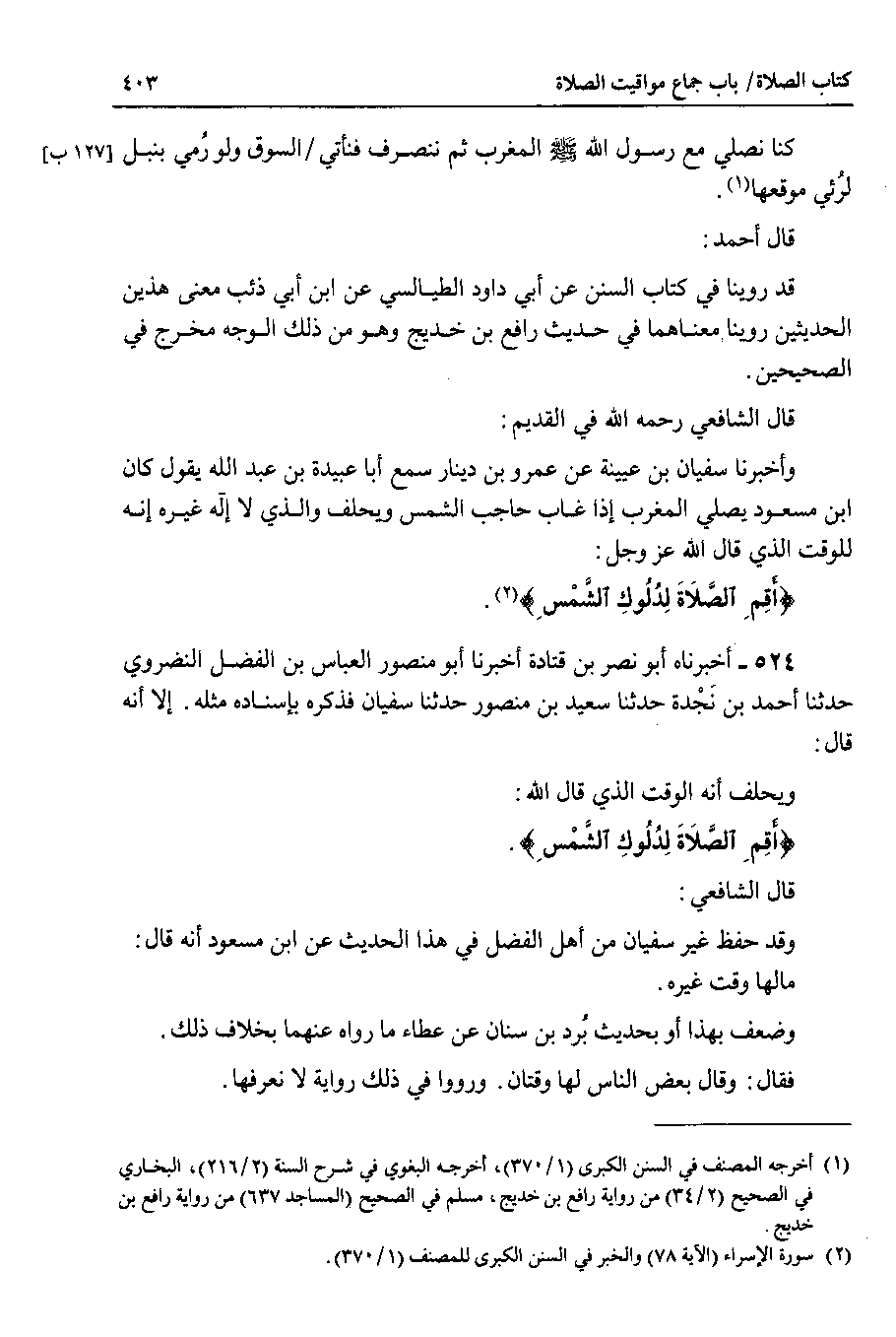 524 - أخبرناه أبو نصر بن قتادة أخبرنا أبو منصور العباس بن الفضل النضروي حدثنا أحمد بن نجدة حدثنا سعيد بن منصور حدثنا سفيان فذكره بإسناده مثله . إلا أنه قال : ويحلف أنه الوقت الذي قال الله {أقم الصلاة لدلوك الشمس} قال الشافعي : وقد حفظ غير سفيان من أهل الفضل في هذا الحديث عن ابن مسعود أنه قال : مالها وقت غيره.