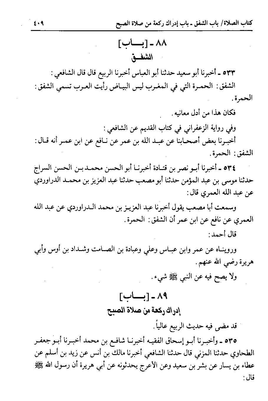 534 - أخبرنا أبو نصر بن قتادة أخبرنا أبو الحسن محمد بن الحسن السراج حدثنا موسى بن عبد المؤمن حدثنا أبو مصعب حدثنا عبد العزيز بن محمد الدراوردي عن عبد الله العمري قال : وسمعت أبا مصعب يقول أخبرنا عبد العزيز بن محمد الدراوردي عن عبد الله العمري عن نافع عن ابن عمر أن الشفق : الحمرة.