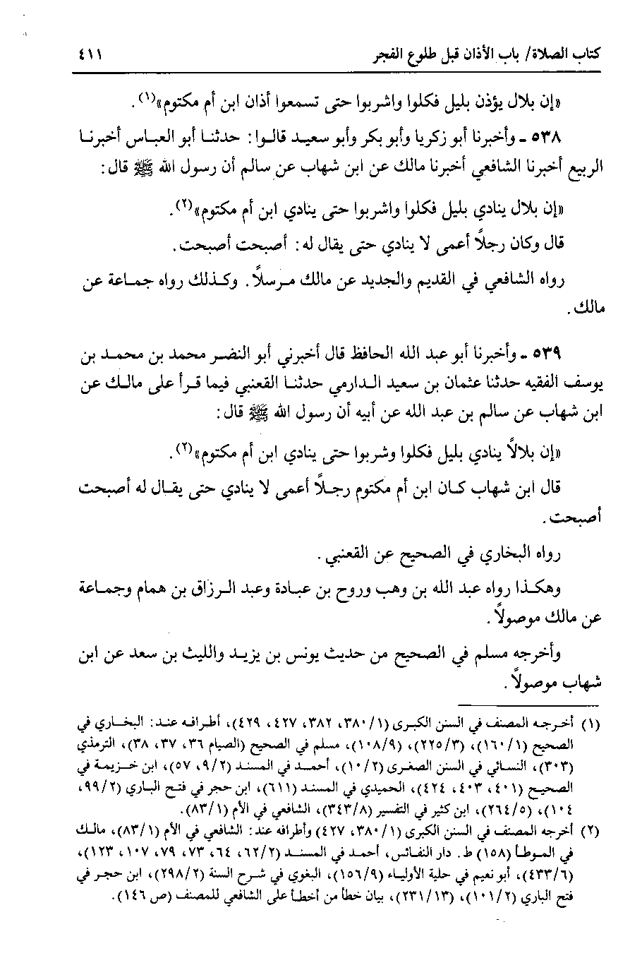 539 - وأخبرنا أبو عبدالله الحافظ قال أخبرني أبو النضر محمد بن محمد بن يوسف الفقيه حدثنا عثمان بن سعيد الدارمي حدثنا القعنبي فيما قرأ على مالك عن ابن شهاب عن سالم بن عبد الله عن أبيه أن رسول الله صلى الله عليه وسلم قال : إن بلالا ينادي بليل فكلوا واشربوا حتى ينادي ابن أم مكتوم.