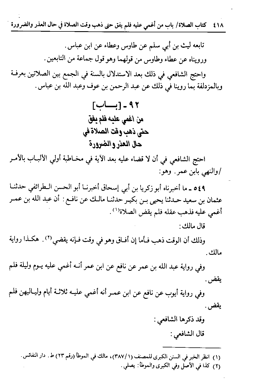احتج الشافعي في أن لا قضاء عليه بعد الآية في مخاطبة أولي الألباب بالأمر والنهي بابن عمر . وهو 549 - ما أخبرناه أبو زكريا بن أبي إسحاق أخبرنا أبو الحسن الطرائفي حدثنا عثمان بن سعيد حدثنا يحيى بن بكير حدثنا مالك عن نافع : أن عبد الله بن عمر أغمي عليه فذهب عقله فلم يقض الصلاة.