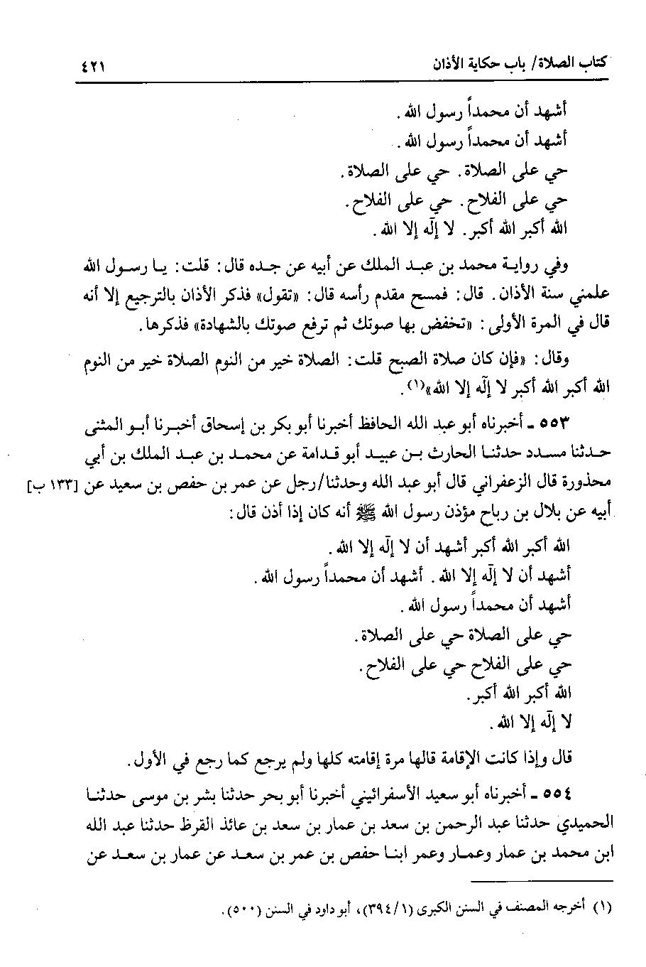553 - أخبرناه أبو عبد الله الحافظ أخبرنا أبو بكر بن إسحاق أخبرنا أبو المثنى حدثنا مسدد حدثنا الحارث بن عبيد أبو قدامة عن محمد بن عبد الملك بن أبي محذورة قال الزعفراني قال أبو عبد الله وحدثنا رجل عن عمر بن حفص بن سعيد عن أبيه عن بلال بن رباح مؤذن رسول الله صلى الله عليه وسلم أنه كان إذا أذن قال : الله أكبر الله أكبر أشهد أن لا إله إلا الله.