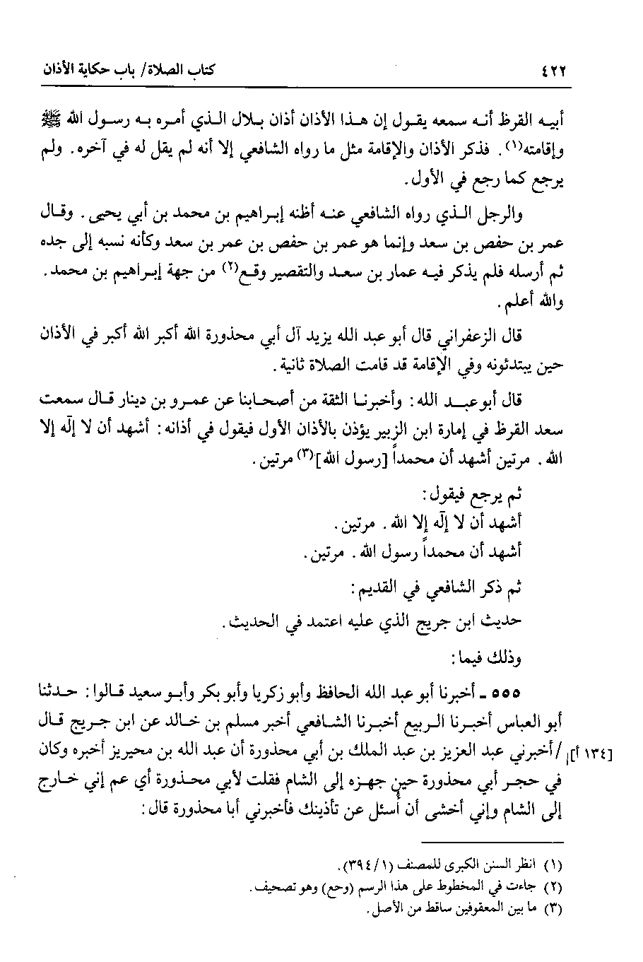 قال أبو عبد الله : وأخبرنا الثقة من أصحابنا عن عمرو بن دينار قال سمعت سعد القرظ في إمارة ابن الزبير يؤذن بالأذان الأول فيقول في أذانه : أشهد أن لا إله إلا الله . مرتين أشهد أن محمدا رسول الله مرتين.