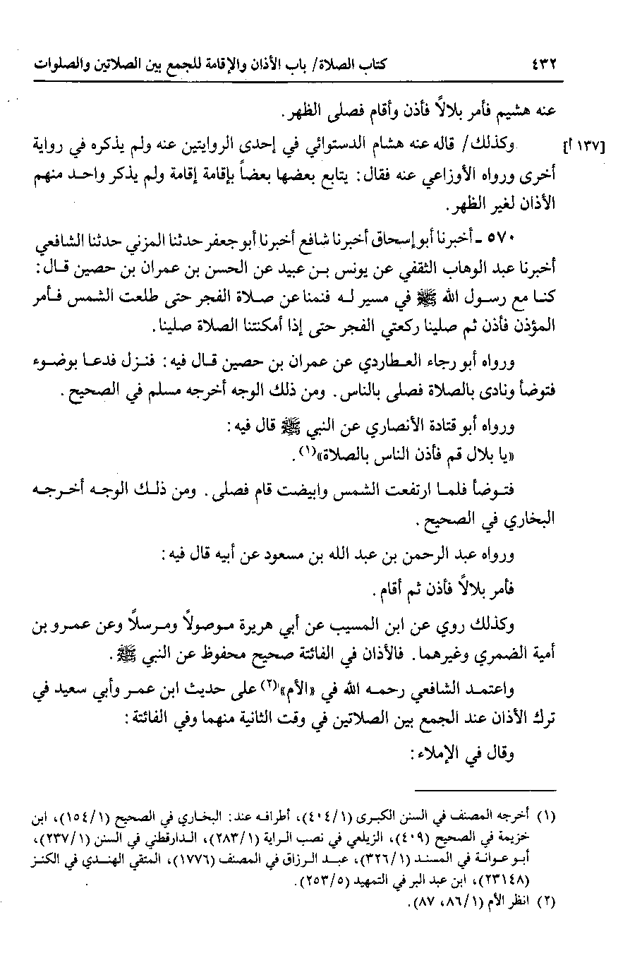 واعتمد الشافعي رحمه الله في الأم على حديث ابن عمر وأبي سعيد في ترك الأذان عند الجمع بين الصلاتين في وقت الثانية منهما وفي الفائتة : وقال في الإملاء