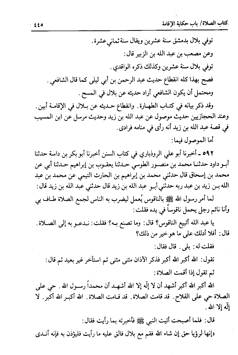وعند الحجازيين حديث موصول عن عبد الله بن زيد وحديث مرسل عن ابن المسيب في قصة عبد الله بن زيد أنه رأى في منامه فرادى.