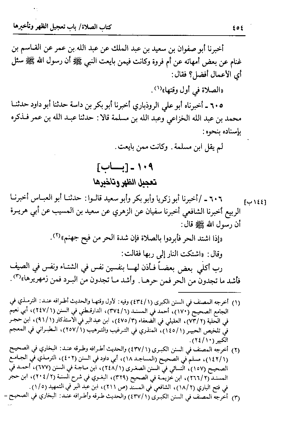 606 - أخبرنا أبو زكريا وأبو بكر وأبو سعيد قالوا : حدثنا أبو العباس أخبرنا الربيع أخبرنا الشافعي أخبرنا سفيان عن الزهري عن سعيد بن المسيب عن أبي هريرة أن رسول الله صلى الله عليه وسلم قال : إذا اشتد الحر فأبردوا بالصلاة فإن شدة الحر من فيح جهنم.