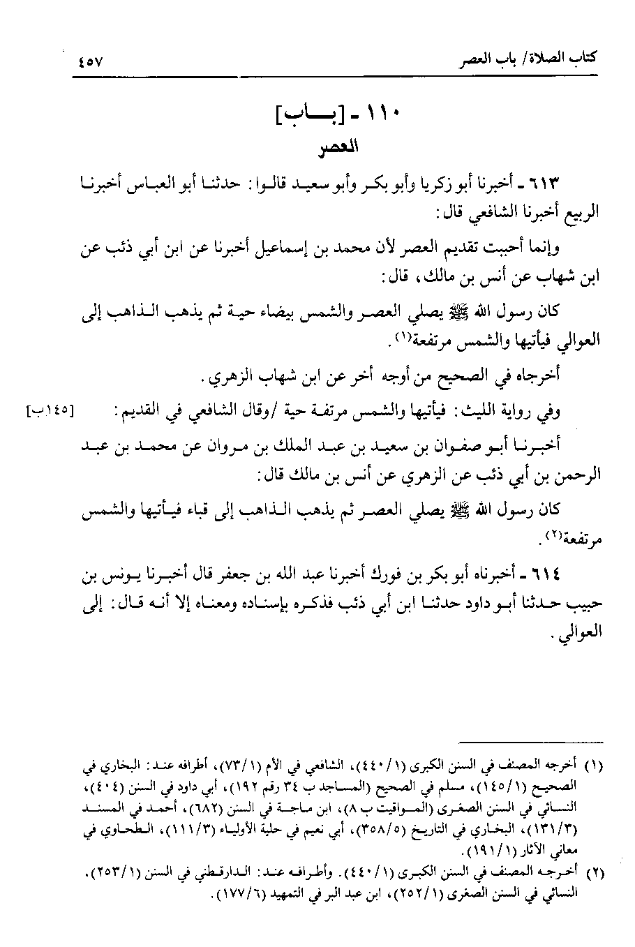 613 - أخبرنا أبو زكريا وأبو بكر وأبو سعيد قالوا : حدثنا أبو العباس أخبرنا الربيع أخبرنا الشافعي قال : وإنما أحببت تقديم العصر لأن محمد بن إسماعيل أخبرنا عن ابن أبي ذئب عن ابن شهاب عن أنس بن مالك ، قال : كان رسول الله صلى الله عليه وسلم يصلي العصر والشمس بيضاء حية ثم يذهب الذاهب إلى العوالي فيأتيها والشمس مرتفعة.