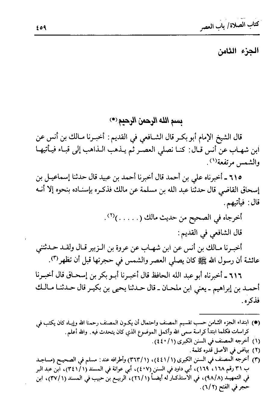 الجزء الثامن بسم الله الرحمن الرحيم قال الشيخ الإمام أبو بكر قال الشافعي في القديم : أخبرنا مالك بن أنس عن ابن شهاب عن أنس قال : كنا نصلي العصر ثم يذهب الذاهب إلى قباء فيأتيها والشمس مرتفعة.