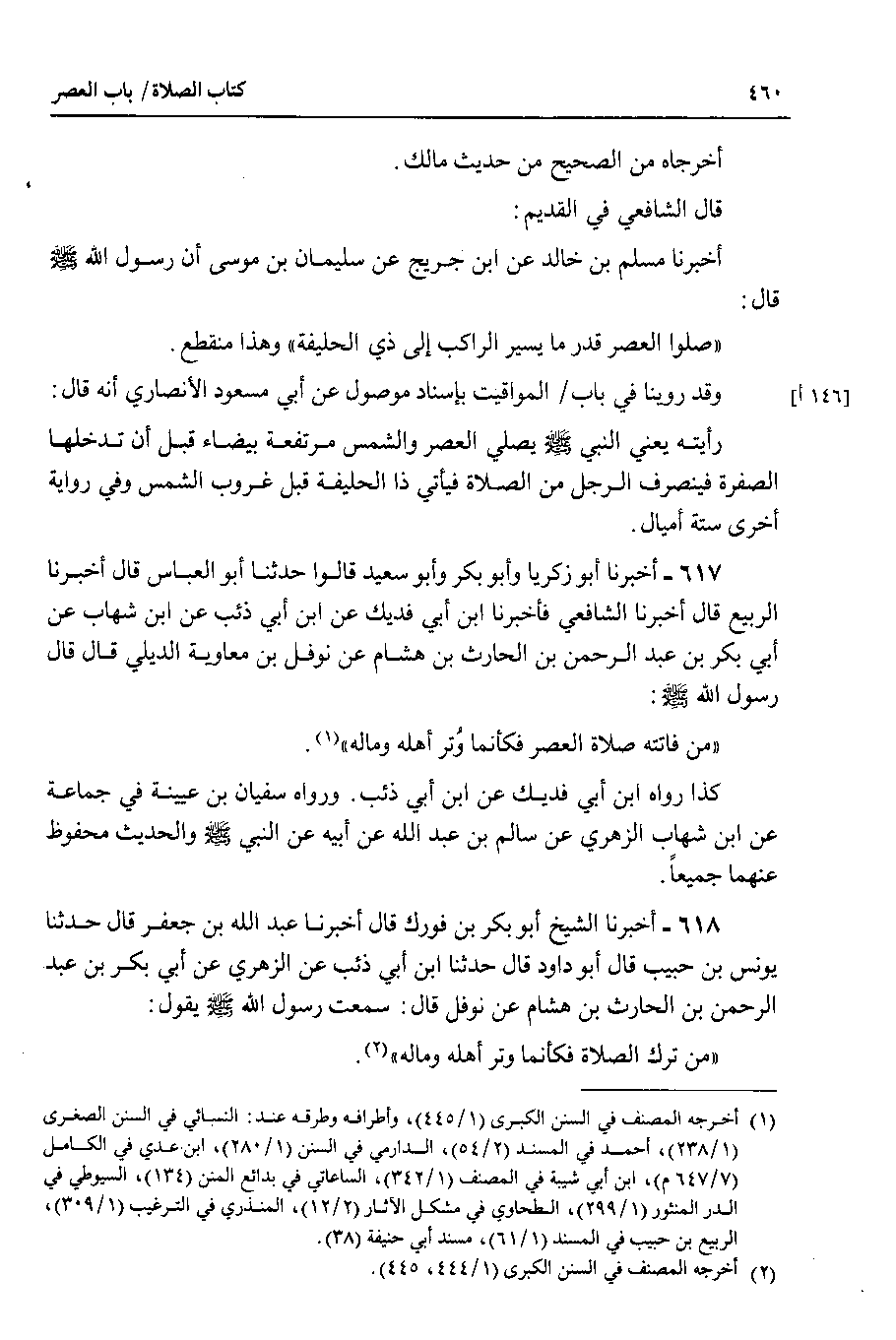 617 - أخبرنا أبو زكريا وأبو بكر وأبو سعيد قالوا حدثنا أبو العباس قال أخبرنا الربيع قال أخبرنا الشافعي فأخبرنا ابن أبي فديك عن ابن أبي ذئب عن ابن شهاب عن أبي بكر بن عبد الرحمن بن الحارث بن هشام عن نوفل بن معاوية الديلي قال قال رسول الله صلى الله عليه وسلم : من فاتته صلاة العصر فكأنما وتر أهله وماله.