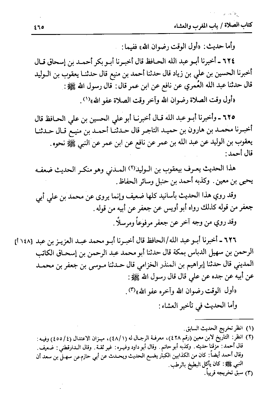 وأما حديث : أول الوقت رضوان الله ففيما 624 - أخبرنا أبو عبد الله الحافظ قال أخبرنا أبو بكر أحمد بن إسحاق قال أخبرنا الحسين بن علي بن زياد قال حدثنا أحمد بن منيع قال حدثنا يعقوب بن الوليد قال حدثنا عبد الله العمري عن نافع عن ابن عمر قال : قال رسول الله صلى الله عليه وسلم : أول وقت الصلاة رضوان الله وآخر وقت الصلاة عفو الله.