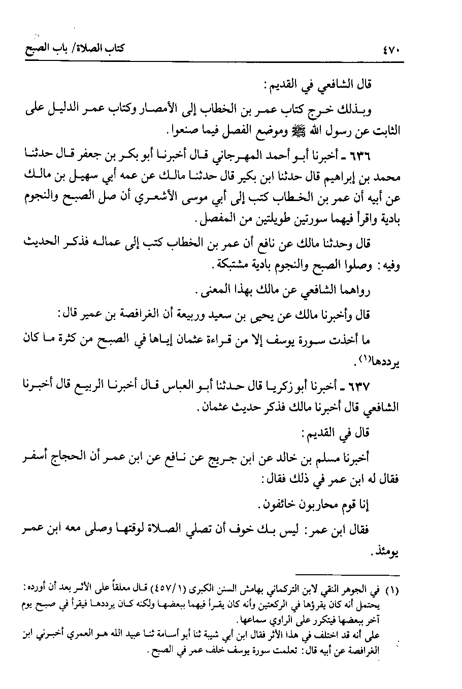 636 - أخبرنا أبو أحمد المهرجاني قال أخبرنا أبو بكر بن جعفر قال حدثنا محمد بن إبراهيم قال حدثنا ابن بكير قال حدثنا مالك عن عمه أبي سهيل بن مالك عن أبيه أن عمر بن الخطاب كتب إلى أبي موسى الأشعري أن صل الصبح والنجوم بادية واقرأ فيهما سورتين طويلتين من المفصل.