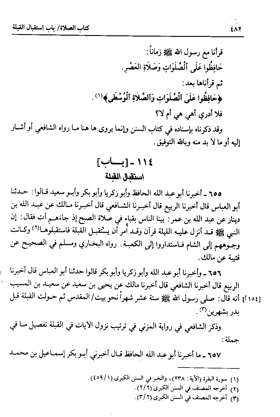 655 - أخبرنا أبو عبد الله الحافظ وأبو زكريا وأبو بكر وأبو سعيد قالوا : حدثنا أبو العباس قال أخبرنا الربيع قال أخبرنا الشافعي قال أخبرنا مالك عن عبد الله بن دينار عن عبد الله بن عمر : بينا الناس بقباء في صلاة الصبح إذ جاءهم آت فقال : إن النبي صلى الله عليه وسلم قد أنزل عليه الليلة قرآن وقد أمر أن يستقبل القبلة فاستقبلوها وكانت وجوههم إلى الشام فاستداروا إلى الكعبة . رواه البخاري ومسلم في الصحيح عن قتيبة عن مالك.
