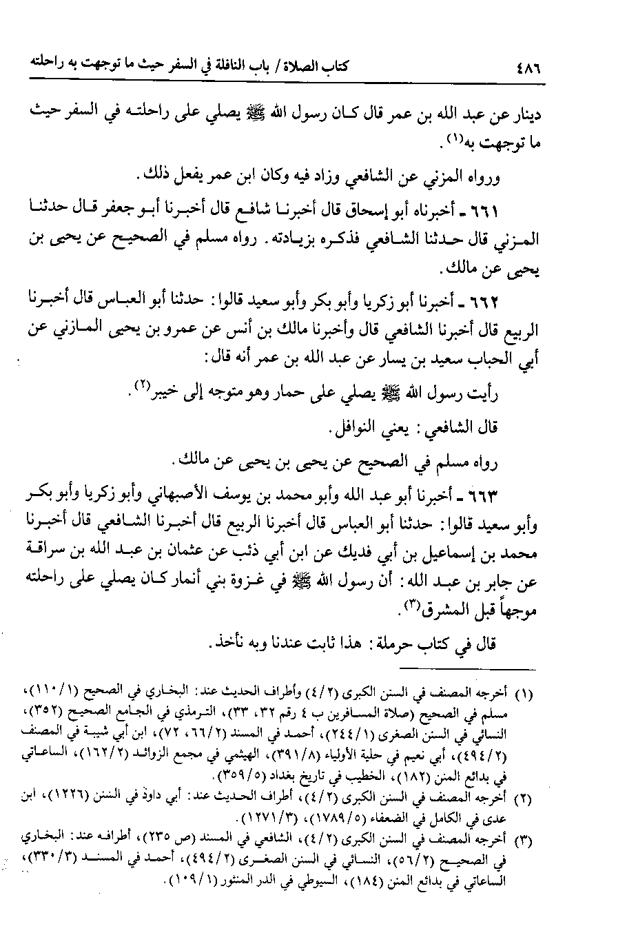 663 - أخبرنا أبو عبد الله وأبو محمد بن يوسف الأصبهاني وأبو زكريا وأبو بكر وأبو سعيد قالوا : حدثنا أبو العباس قال أخبرنا الربيع قال أخبرنا الشافعي قال أخبرنا محمد بن إسماعيل بن أبي فديك عن ابن أبي ذئب عن عثمان بن عبد الله بن سراقة عن جابر بن عبد الله : أن رسول الله صلى الله عليه وسلم في غزوة بني أنمار كان يصلي على راحلته موجها قبل المشرق.