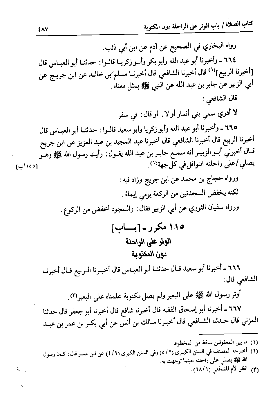 666 - أخبرنا أبو سعيد قال حدثنا أبو العباس قال أخبرنا الربيع قال أخبرنا الشافعي قال : أوتر رسول الله صلى الله عليه وسلم على البعير ولم يصل مكتوبة علمناه على البعير.