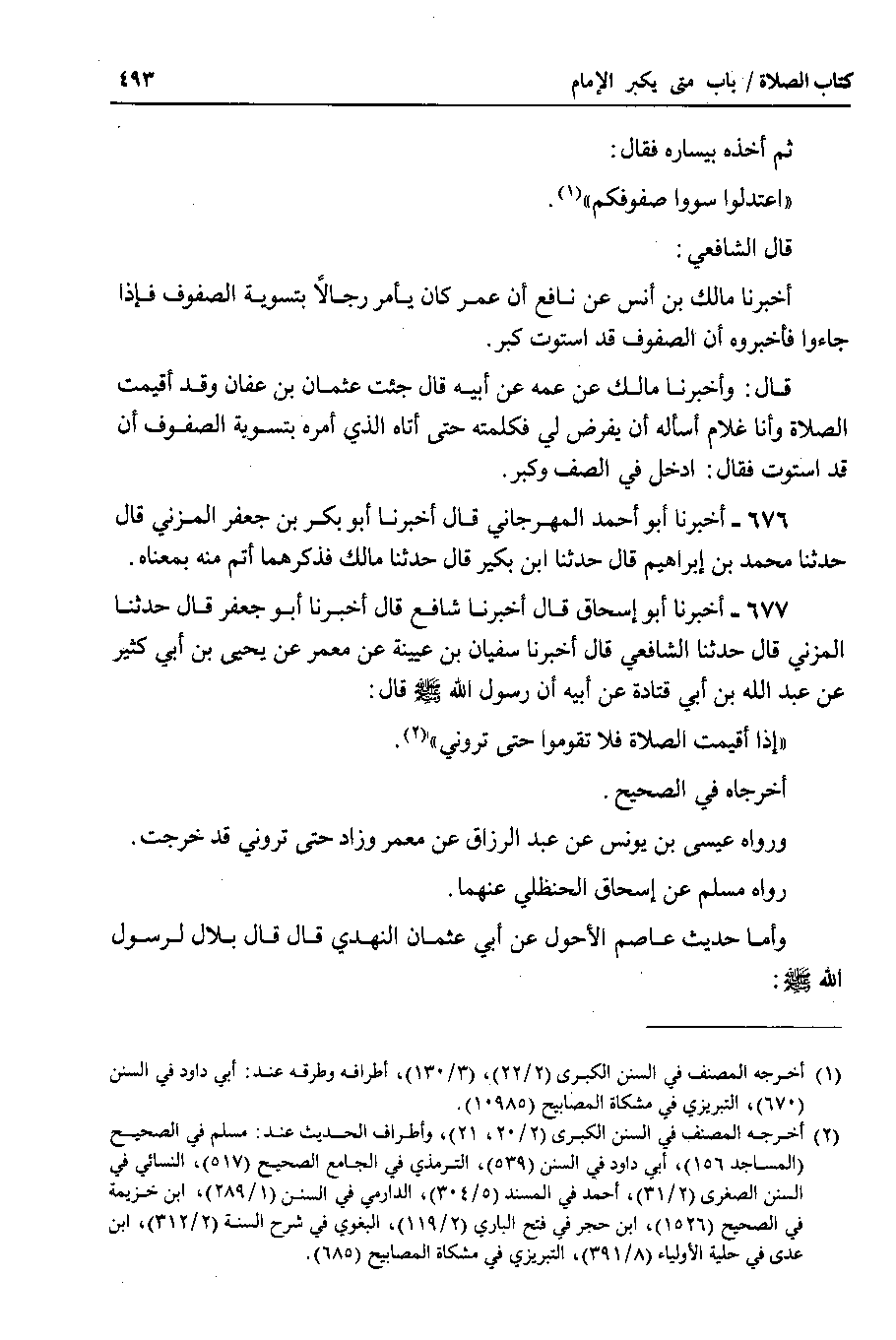قال : وأخبرنا مالك عن عمه عن أبيه قال جئت عثمان بن عفان وقد أقيمت الصلاة وأنا غلام أسأله أن يفرض لي فكلمته حتى أتاه الذي أمره بتسوية الصفوف أن قد استوت فقال : ادخل في الصف وكبر.