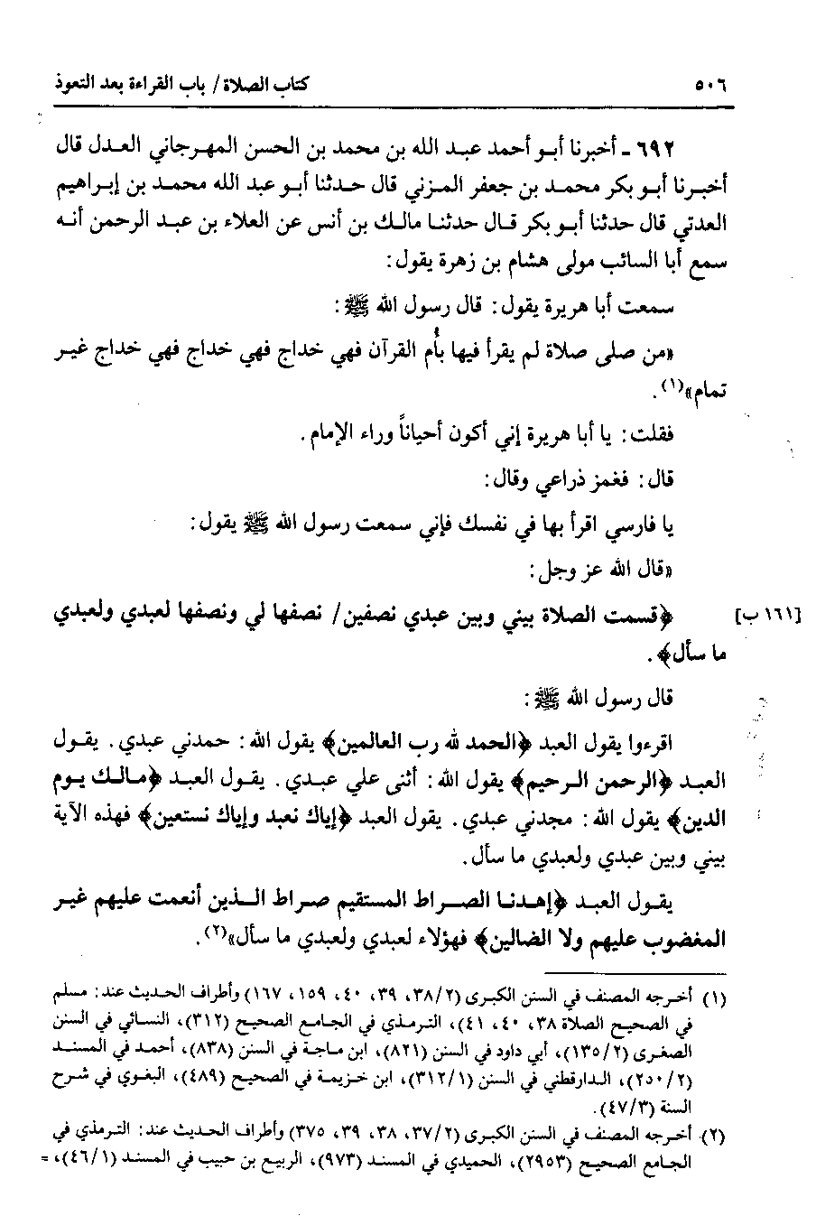 قال : فغمز ذراعي وقال : يا فارسي اقرأ بها في نفسك فإني سمعت رسول الله صلى الله عليه وسلم يقول : قال الله عز وجل : {قسمت الصلاة بيني وبين عبدي نصفين نصفها لي ونصفها لعبدي ولعبدي ما سأل} قال رسول الله صلى الله عليه وسلم : اقرءوا يقول العبد {الحمد لله رب العالمين} يقول الله : حمدني عبدي . يقول العبد {الرحمن الرحيم} يقول الله : أثنى علي عبدي . يقول العبد {مالك يوم الدين} يقول الله : مجدني عبدي . يقول العبد {إياك نعبد وإياك نستعين} فهذه الآية بيني وبين عبدي ولعبدي ما سأل.