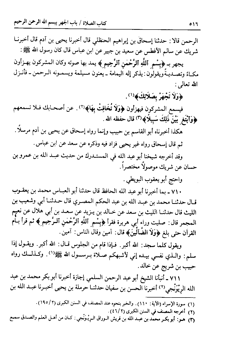 6 @الرحمن قالا : حدثنا إسحاق بن إبراهيم الحنظلي قال أخبرنا يحيى بن آدم قال أخبرنا شريك عن سالم الأفطس عن سعيد بن جبير عن ابن عباس قال كان رسول الله صلى الله عليه وسلم : يجهر ب {بسم الله الرحمن الرحيم} يمد بها صوته وكان المشركون يهزأون مكاء وتصدية ويقولون : يذكر إله اليمامة - يعنون مسيلمة ويسمونه الرحمن - فأنزل الله تعالى : {ولا تجهر بصلاتك}.
