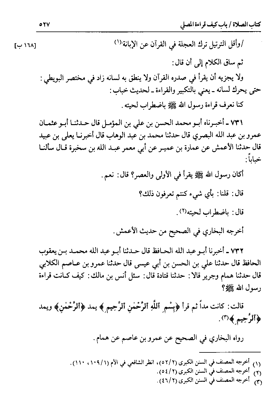 732 - أخبرنا أبو عبد الله الحافظ قال حدثنا أبو عبد الله محمد بن يعقوب الحافظ قال حدثنا علي بن الحسن بن أبي عيسى قال حدثنا عمرو بن عاصم الكلابي قال حدثنا همام وجرير قالا : حدثنا قتادة قال : سئل أنس بن مالك : كيف كانت قراءة رسول الله صلى الله عليه وسلم ؟ قالت : كانت مدا ثم قرأ {بسم الله الرحمن الرحيم} يمد {الرحمن} ويمد {الرحيم}.