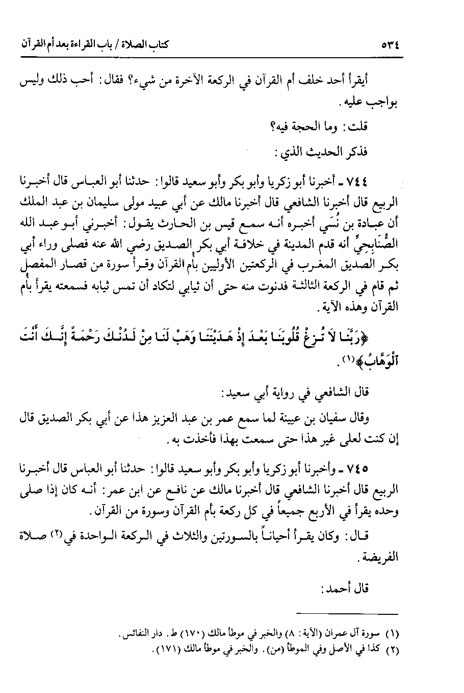 745 - وأخبرنا أبو زكريا وأبو بكر وأبو سعيد قالوا : حدثنا أبو العباس قال أخبرنا الربيع قال أخبرنا الشافعي قال أخبرنا مالك عن نافع عن ابن عمر : أنه كان إذا صلى وحده يقرأ في الأربع جميعا في كل ركعة بأم القرآن وسورة من القرآن.