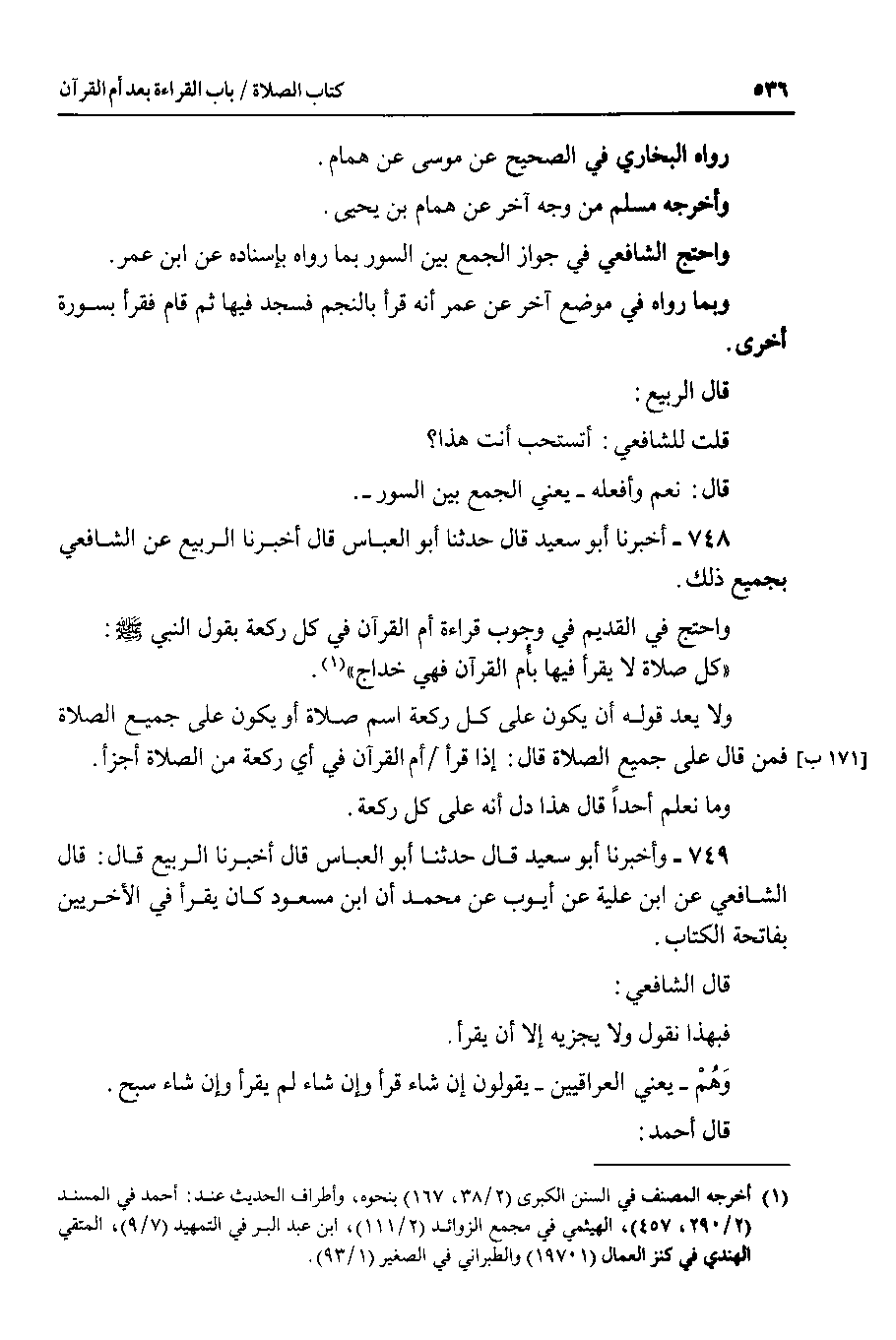 واحتج في القديم في وجوب قراءة أم القرآن في كل ركعة بقول النبي صلى الله عليه وسلم : كل صلاة لا يقرأ فيها بأم القرآن فهي خداج.