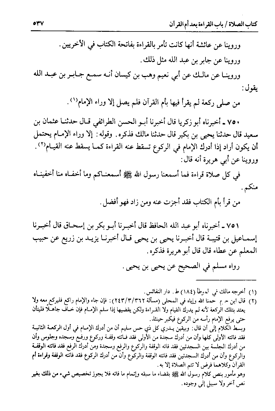750 - أخبرناه أبو زكريا قال أخبرنا أبو الحسن الطرائفي قال حدثنا عثمان بن سعيد قال حدثنا يحيى بن بكير قال حدثنا مالك فذكره . وقوله : إلا وراء الإمام يحتمل أن يكون أراد إذا أدرك الإمام في الركوع تسقط عنه القراءة كما يسقط عنه القيام.