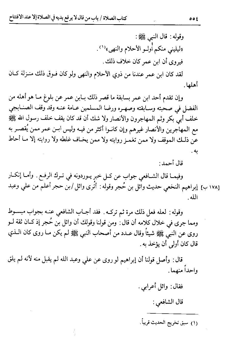 قال أحمد : وفيما قال الشافعي جواب عن كل خبر يوردونه في ترك الرفع . وأما إنكار إبراهيم النخعي حديث وائل بن حجر وقوله : أترى وائل بن حجر أعلم من علي وعبد الله.