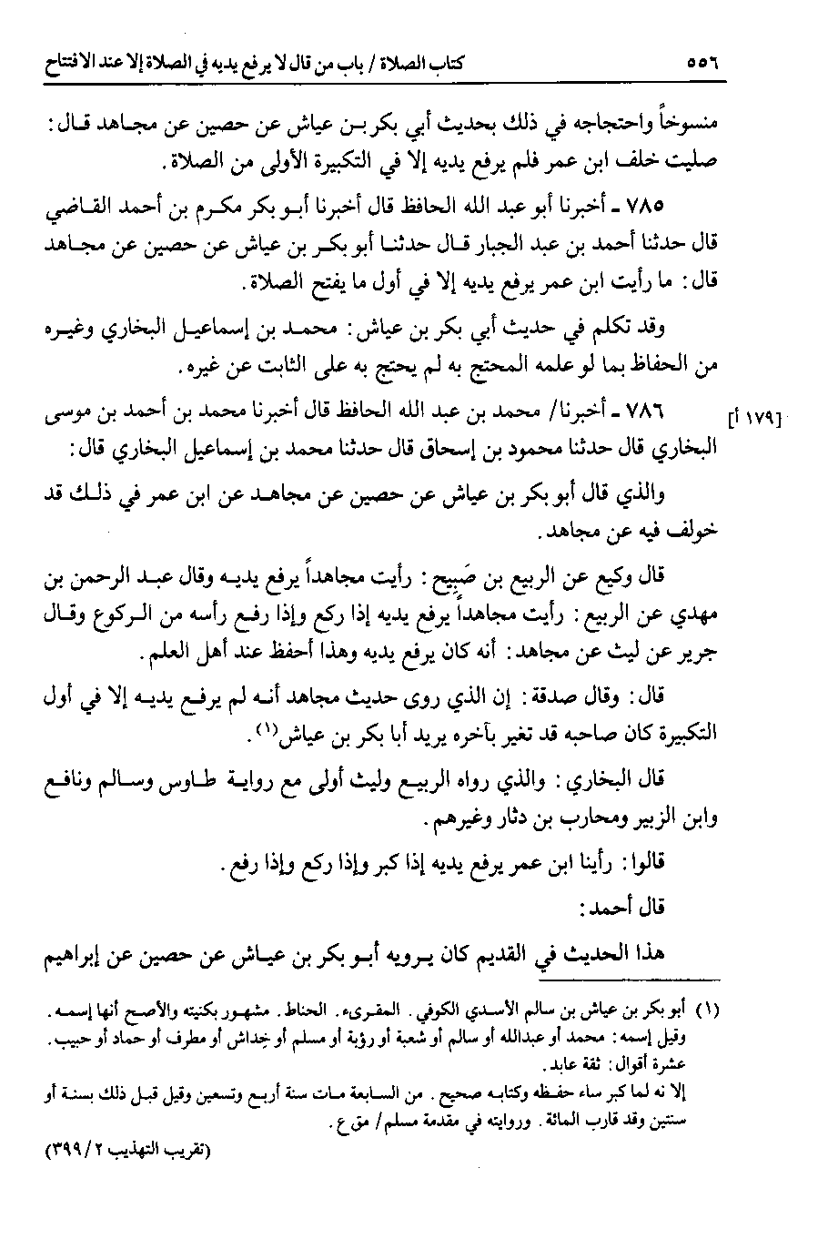 785 - أخبرنا أبو عبد الله الحافظ قال أخبرنا أبو بكر مكرم بن أحمد القاضي قال حدثنا أحمد بن عبد الجبار قال حدثنا أبو بكر بن عياش عن حصين عن مجاهد قال : ما رأيت ابن عمر يرفع يديه إلا في أول ما يفتح الصلاة.