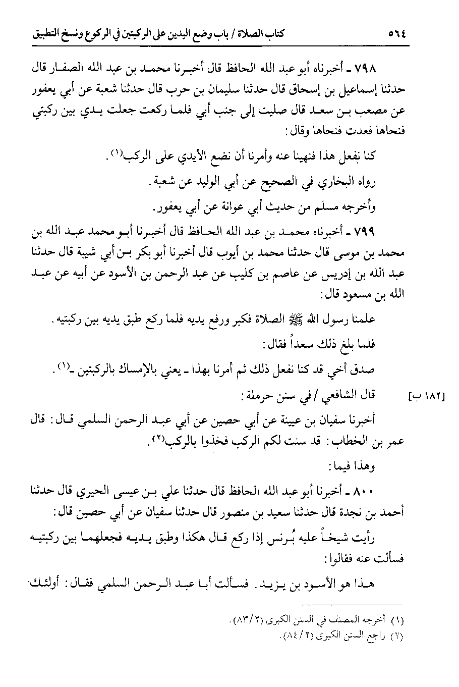 798 - أخبرناه أبو عبد الله الحافظ قال أخبرنا محمد بن عبد الله الصفار قال حدثنا إسماعيل بن إسحاق قال حدثنا سليمان بن حرب قال حدثنا شعبة عن أبي يعفور عن مصعب بن سعد قال صليت إلى جنب أبي فلما ركعت جعلت يدي بين ركبتي فنحاها فعدت فنحاها وقال Y كنا نفعل هذا فنهينا عنه وأمرنا أن نضع الأيدي على الركب.