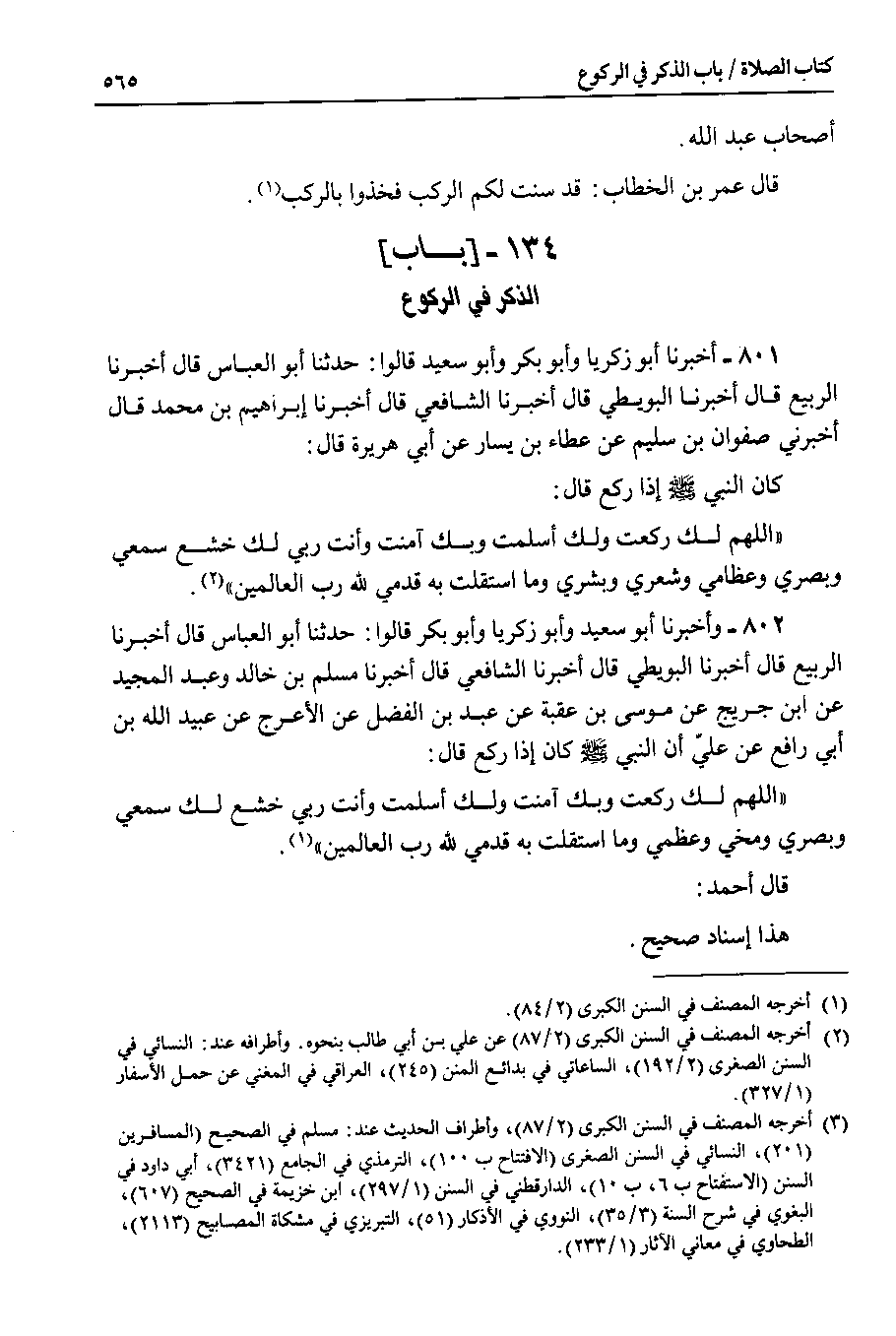 801 - أخبرنا أبو زكريا وأبو بكر وأبو سعيد قالوا : حدثنا أبو العباس قال أخبرنا الربيع قال أخبرنا البويطي قال أخبرنا الشافعي قال أخبرنا إبراهيم بن محمد قال اخبرني صفوان بن سليم عن عطاء بن يسار عن أبي هريرة قال : كان النبي صلى الله عليه وسلم إذا ركع قال اللهم لك ركعت ولك أسلمت وبك آمنت وأنت ربي لك خشع سمعي وبصري وعظامي وشعري وبشري وما استقلت به قدمي لله رب العالمين.
