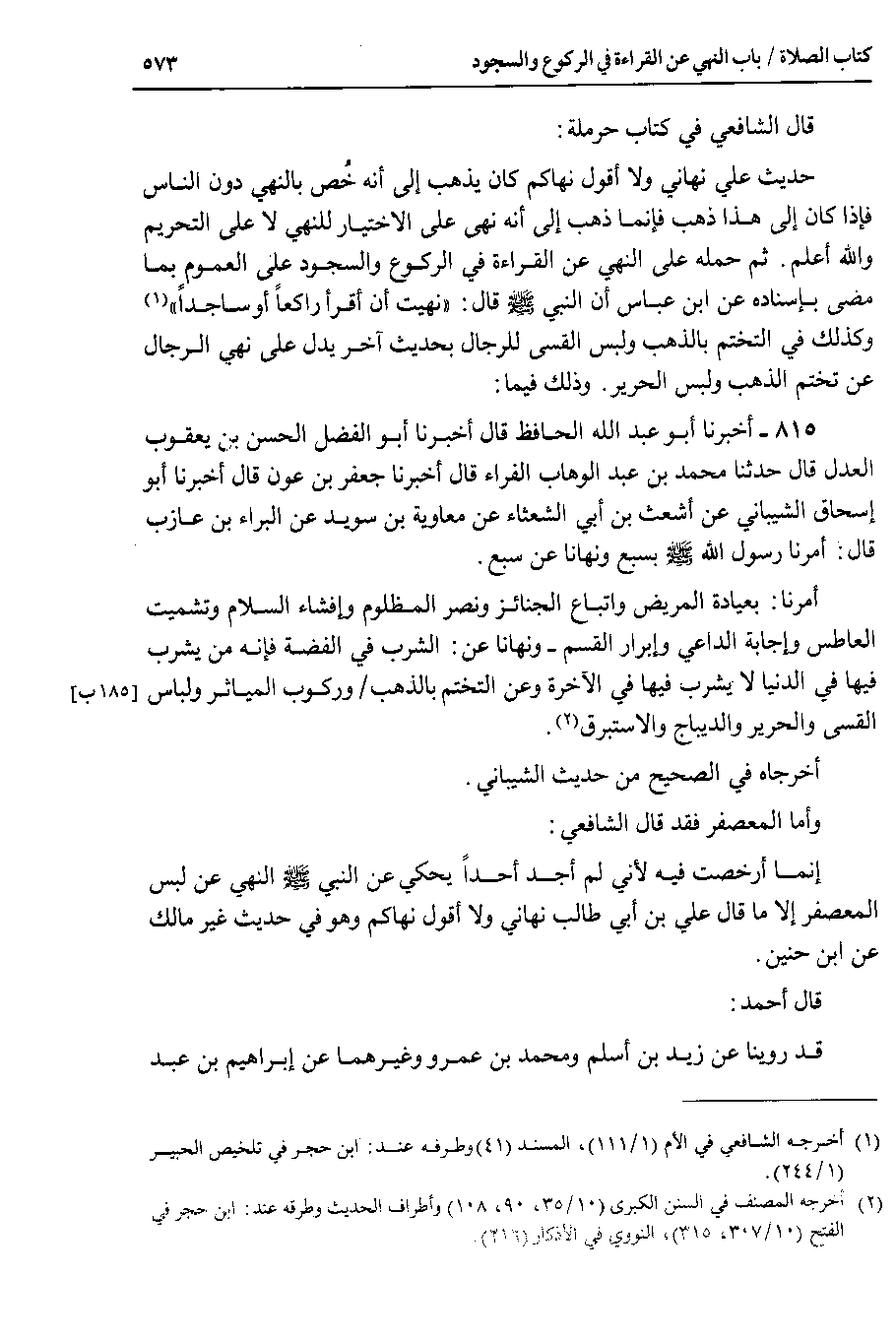 قال الشافعي في كتاب حرملة : حديث علي نهاني ولا أقول نهاكم كان يذهب إلى أنه خص بالنهي دون الناس فإذا كان إلى هذا ذهب فإنما ذهب إلى أنه نهى على الاختيار للنهي لا على التحريم والله أعلم . ثم حمله على النهي عن القراءة في الركوع والسجود على العموم بما مضى بإسناده عن ابن عباس أن النبي صلى الله عليه وسلم قال : نهيت أن أقرأ راكعا أو ساجدا وكذلك في التختم بالذهب ولبس القسى للرجال بحديث آخر يدل على نهي الرجال عن تختم الذهب ولبس الحرير . وذلك فيما 815 - أخبرنا أبو عبد الله الحافظ قال أخبرنا أبو الفضل الحسن بن يعقوب العدل قال حدثنا محمد بن عبد الوهاب الفراء قال أخبرنا جعفر بن عون قال أخبرنا أبو إسحاق الشيباني عن أشعث بن أبي الشعثاء عن معاوية بن سويد عن البراء بن عازب قال : أمرنا رسول الله صلى الله عليه وسلم بسبع ونهانا عن سبع.