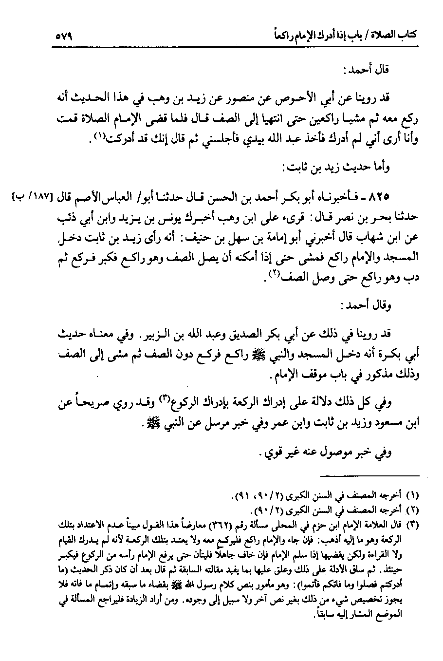 قال أحمد : قد روينا عن أبي الأحوص عن منصور عن زيد بن وهب في هذا الحديث أنه ركع معه ثم مشيا راكعين حتى انتهيا إلى الصف قال فلما قضى الإمام الصلاة قمت وأنا أرى أني لم أدرك فأخذ عبد الله بيدي فأجلسني ثم قال إنك قد أدركت.
