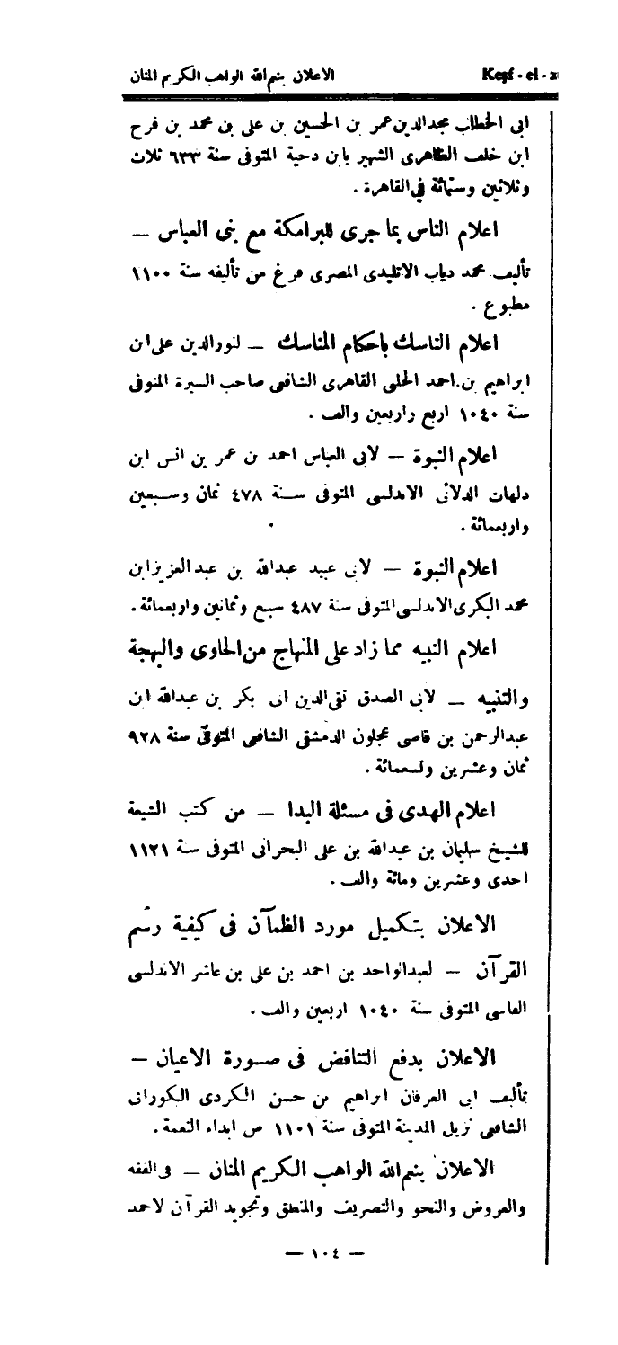 الاعلان بدفع التنافض في صورة الأعيان - تأليف أبي العرفان إبراهيم بن حسن الكردي الكوراني الشافعي نزيل المدينة المتوفى سنة 1101 ص إبداء النعمة.