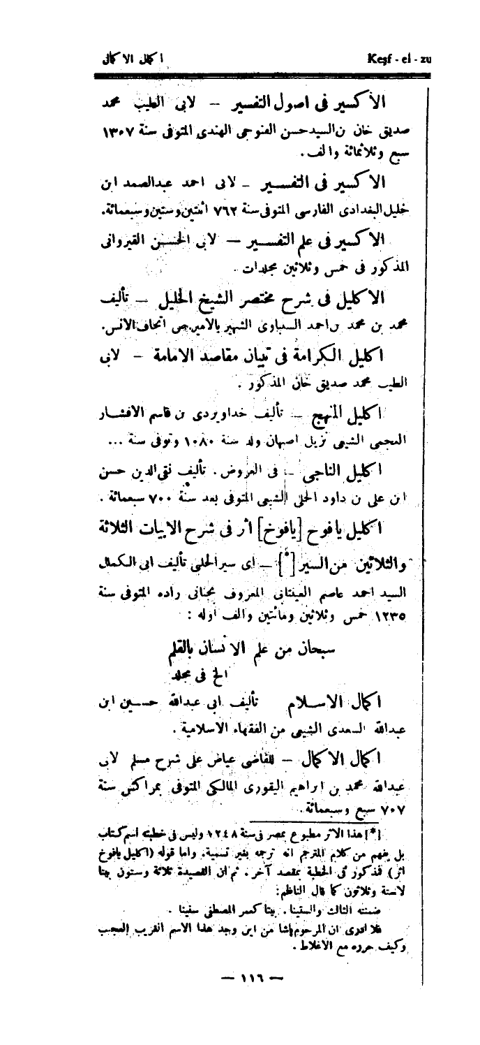 اكليل يا فوح [يا فوخ] أثر في شرح الأبيات الثلاثة والثلاثين من السير [*]- أي سير الحلبي تأليف أبي الكمال السيد أحمد عاصم العينتابي المعروف بجناني راده المتوفى سنة 1235 خمس وثلاثين ومائتين وألف أوله: سبحان من علم الإنسان بالقلم الخ في مجلد إكمال الإسلام تأليف ابى عبد الله حسين ابن عبد الله لسعدى الشيعي من الفقهاء الإسلامية.