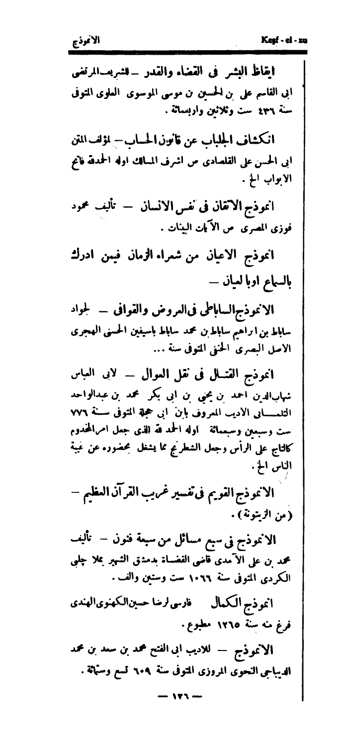 أنموذج الأعيان من شعراء الزمان فيمن أدرك بالسماع أو بالعيان - الأنموذج الساباطي في العروض والقوافي - لجواد ساباط بن إبراهيم ساباط بن محمد ساباط باسيفين الحسني الهجري الأصل البصري الحنفي المتوفى سنة..أنموذج القتال في نقل العوال - لأبي العباس شهاب الدين أحمد بن يحيى بن أبي بكر محمد بن عبد الواحد التلمساني الأديب المعروف بابن أبي حجلة المتوفى سنة 776 ست وسبعين وسبعمائة اوله الحمدلله الذي جعل أمر المخذوم كالتاج على الرأس وجعل الشطرنج مما يشغل بحضوره عن غيبة