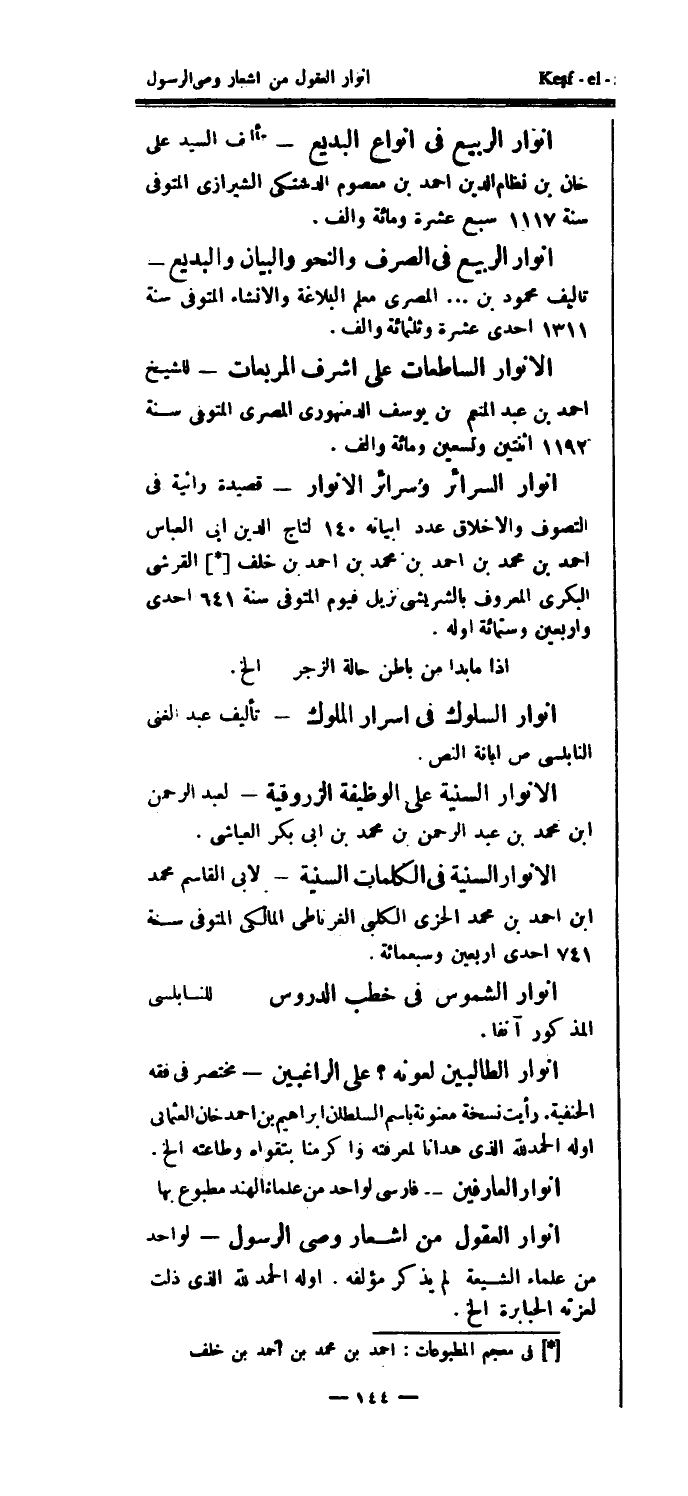 أنوار الربيع في انواع البديع - تألف السيد علي خان بن نظام الدين أحمد بن معصوم الدشتكي الشيرازي المتوفى سنة 1117 سبع عشرة ومائة وألف.