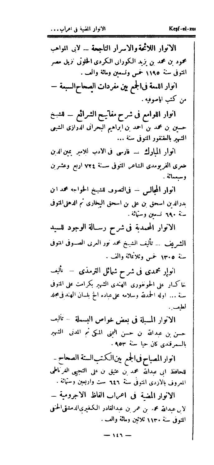 أنوار اللوامع في شرح مفاتيح الشرائع - للشيخ حسين بن محمد بن أحمد بن إبراهيم البحراني الدرازي الشيعي الشهير بالعقنقور المتوفى سنة..انوار المبارك - فارسي في الأدب للأمير يمين الدين طعري الفريومدي الشاعر المتوفى سنة 724 أربع وعشرين وسبعمائة.